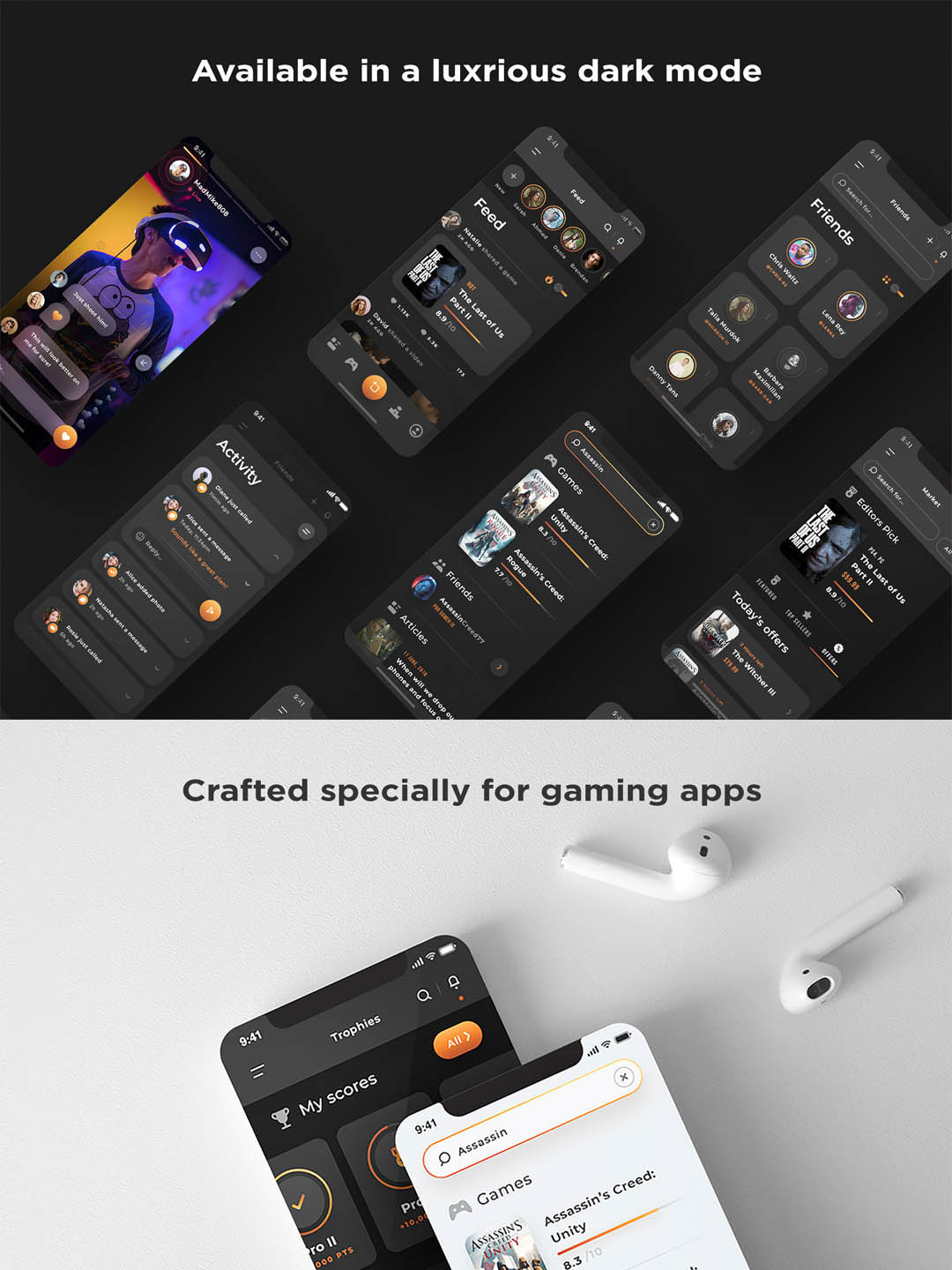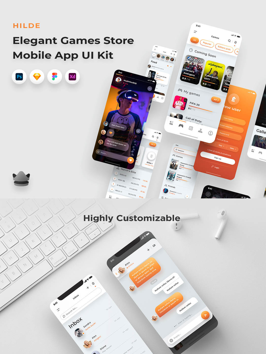 Hilde 共有超过 42 个设计精美的屏幕,提供深色和浅色模式。Hilde 也是高度可定制的、分层的、100% 矢量和有组织的。Hilde 是您下一个游戏应用程序的正确设计!
