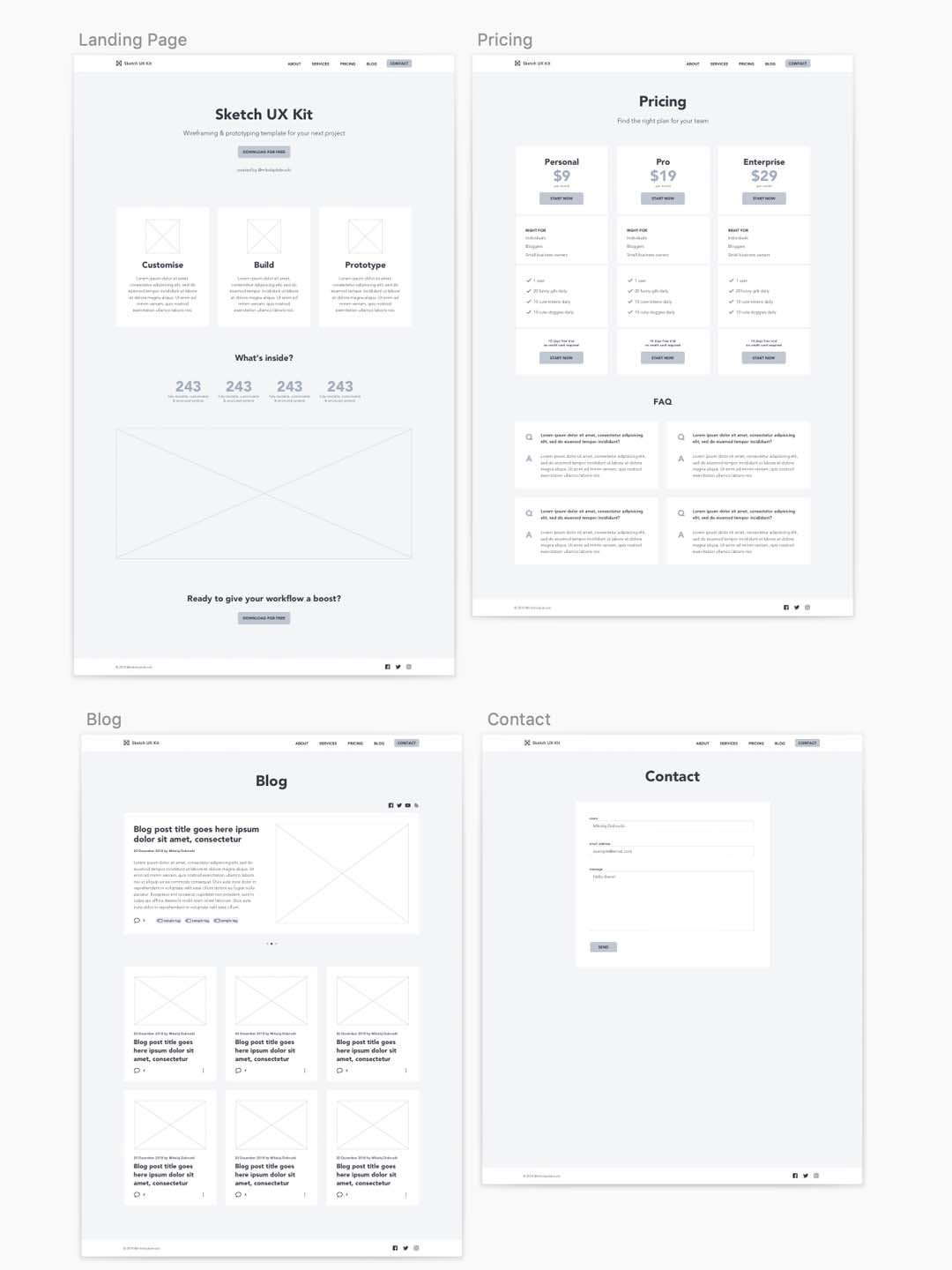 响应式 UI Sketch 工具包资源,旨在成为具有 200 多个随时可用的组件的基本网站模板。