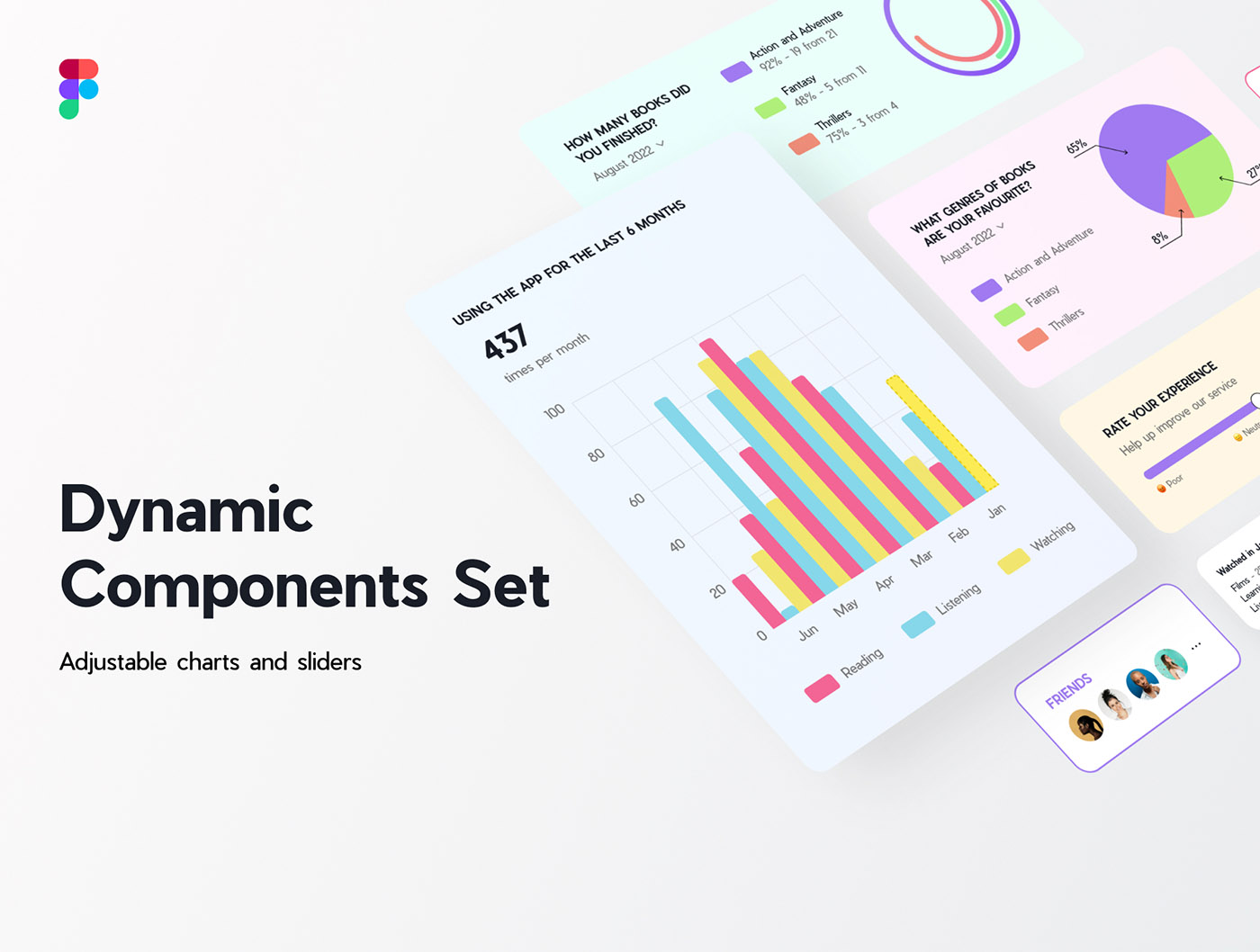 动态 Figma 组件,包含:可调整的条形图、饼图、滑块……