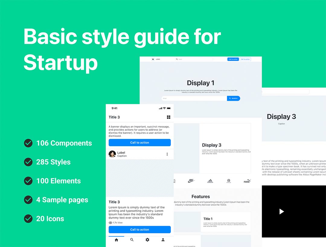 106 个组件 285 种样式 100 个元素 4 个示例页面 20 个图标