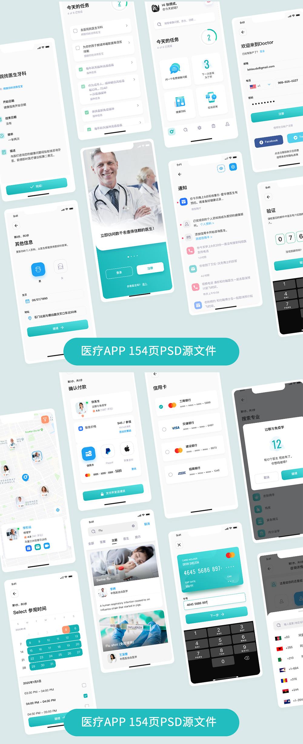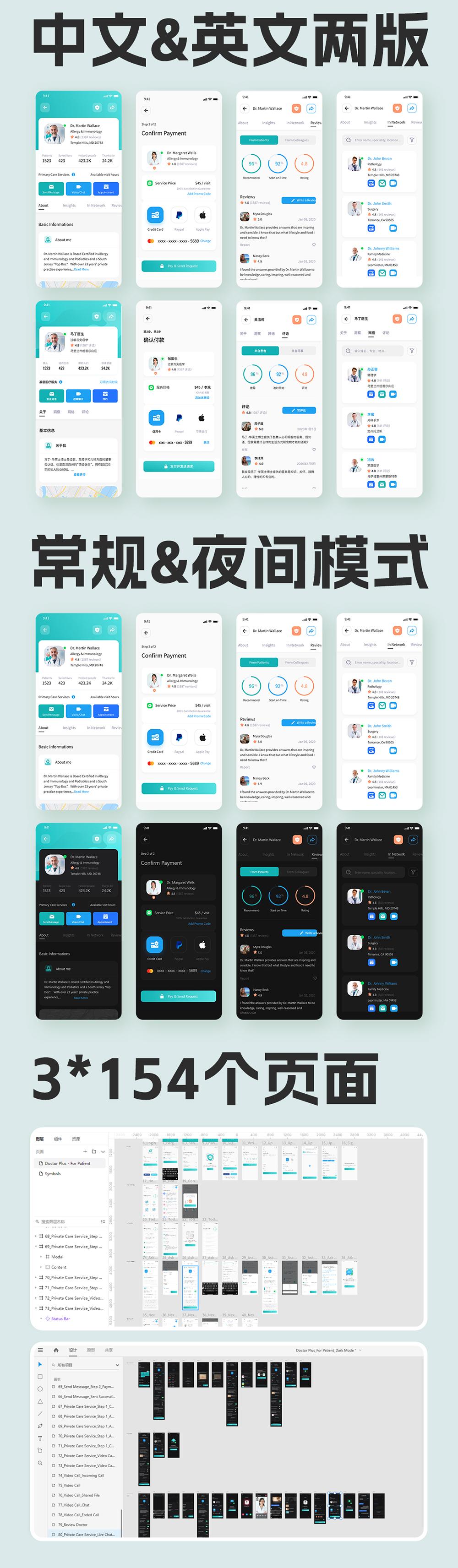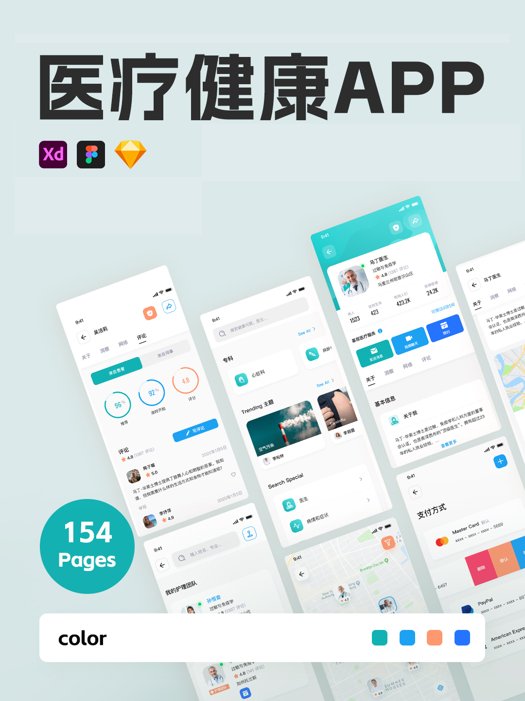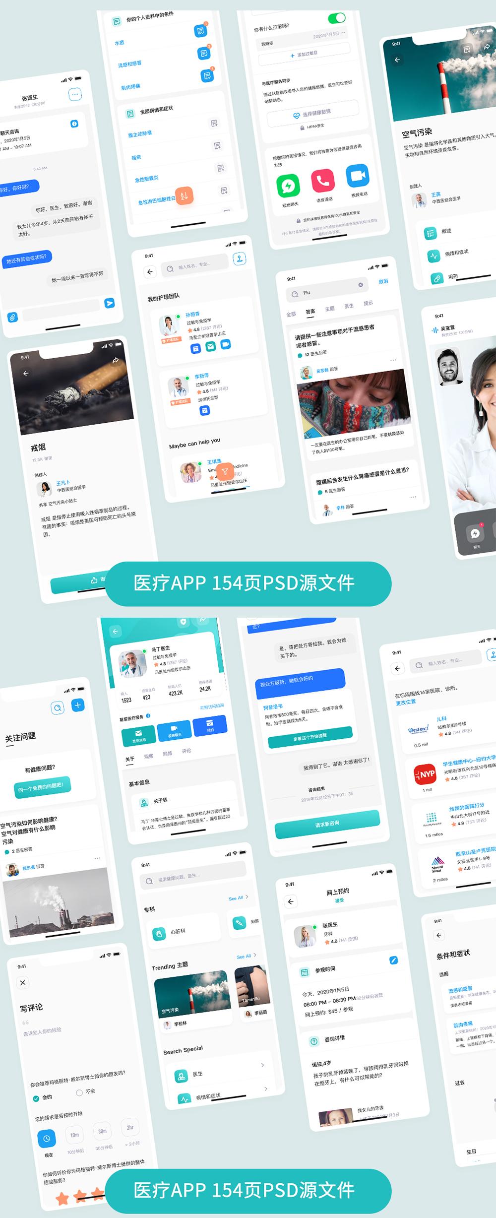 150页医疗健康APP全套UI模板 |医疗APPFigma、Sketch 和 XD源文件