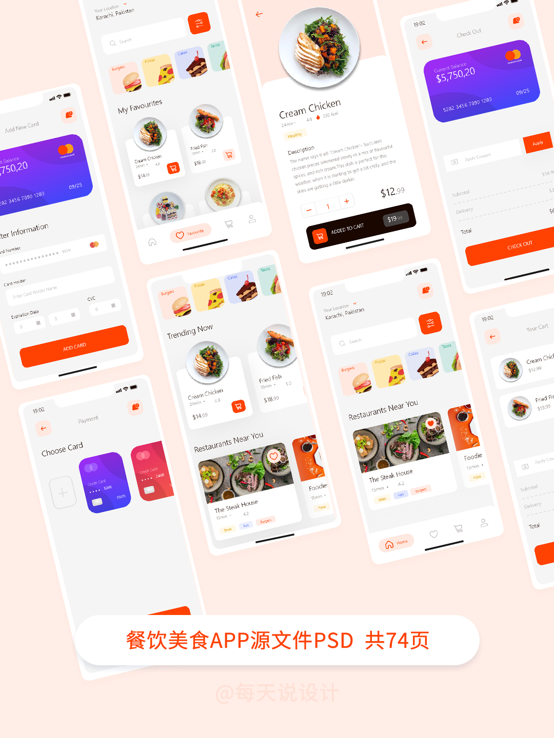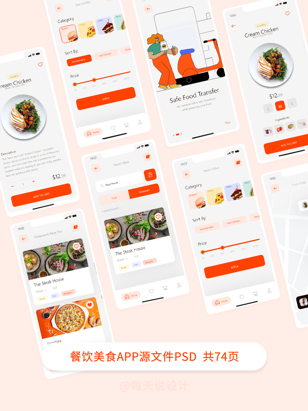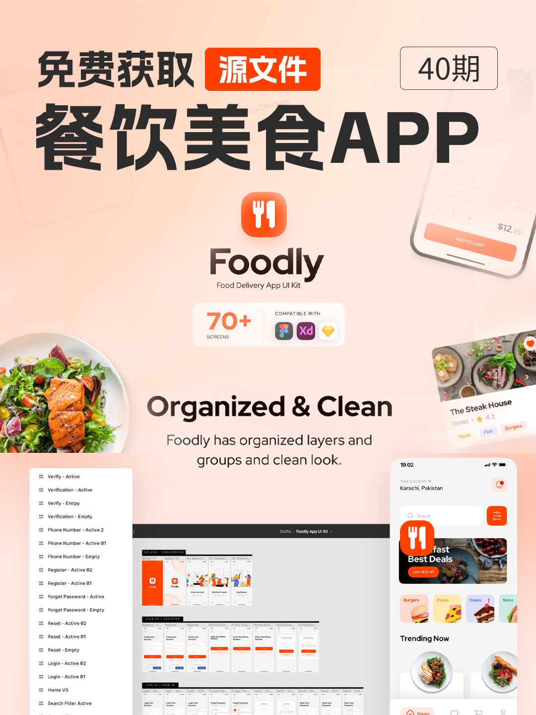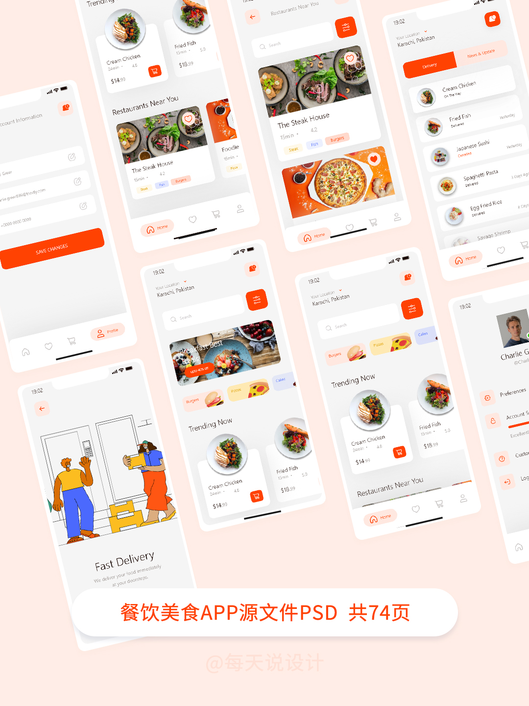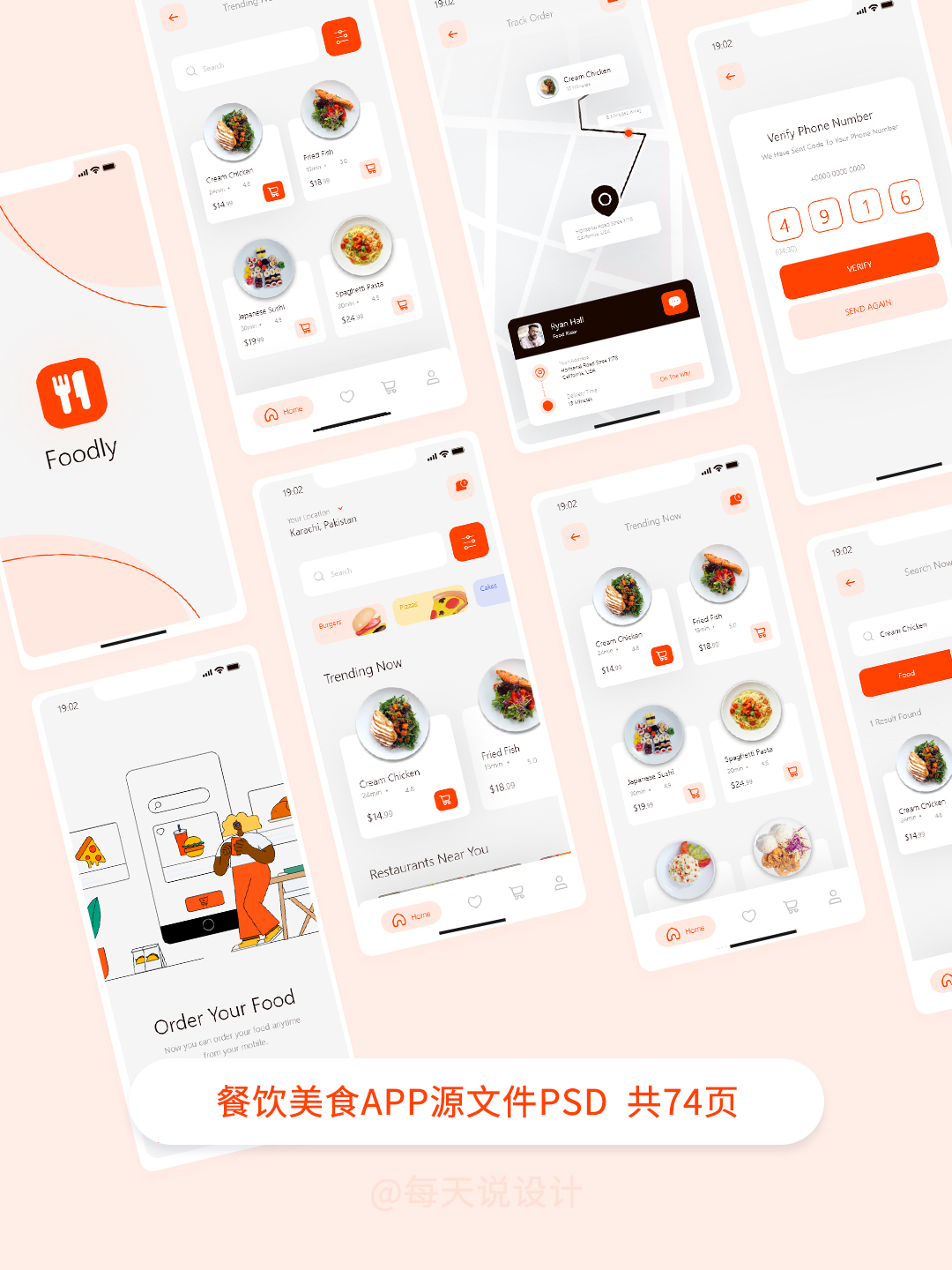 餐饮美食APP设计源文件,包含登录注册、线上订餐、外卖物流、个人中心等,Figma、XD、Sketch格式