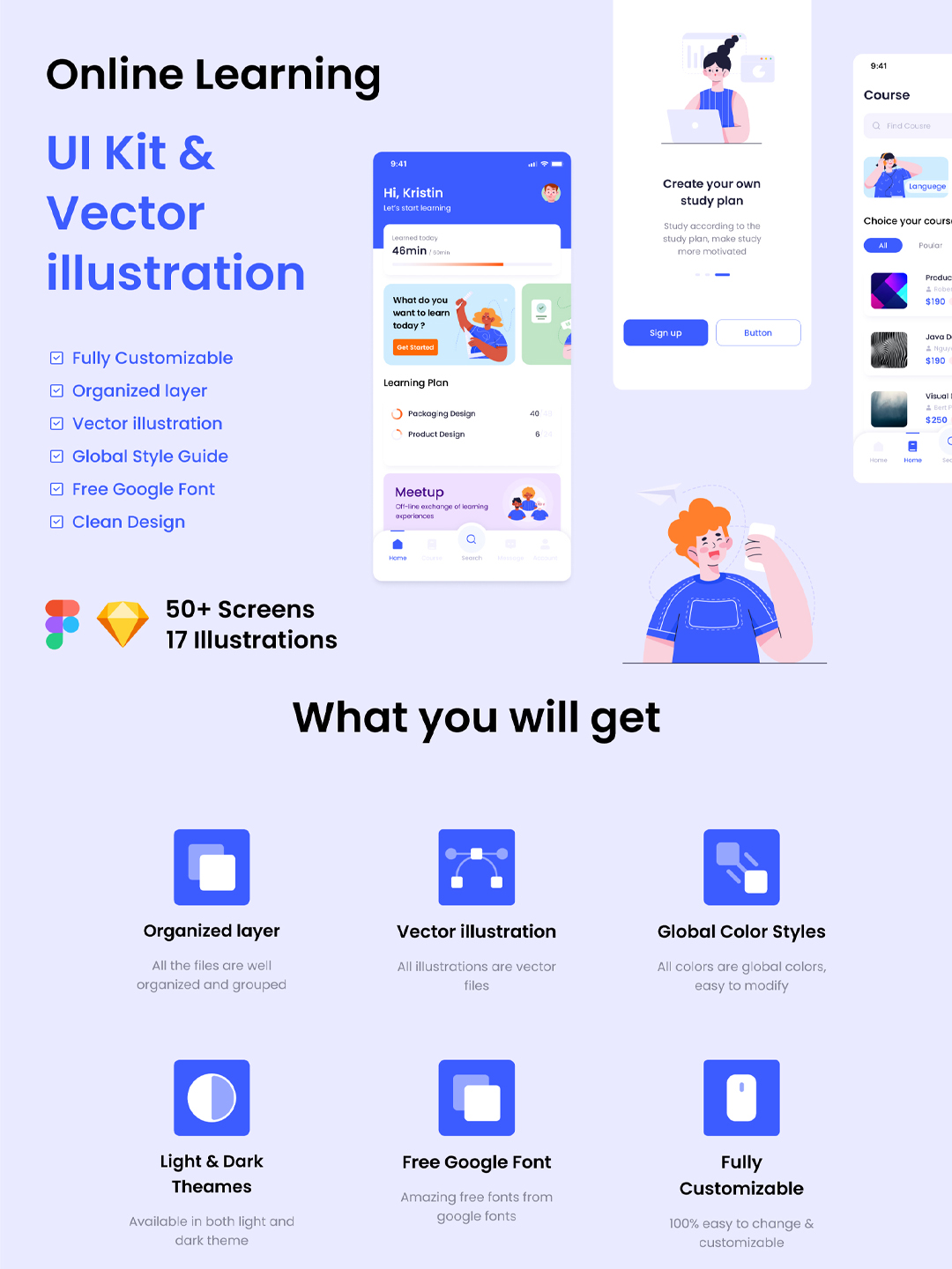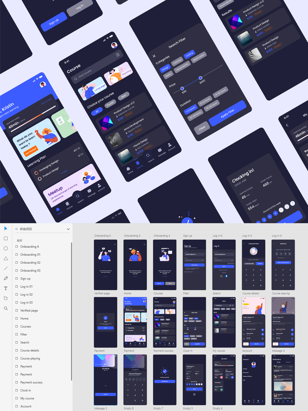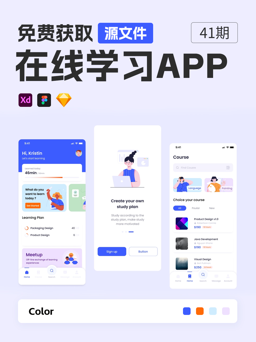 在线学习APP设计源文件,包含白天和夜间模式,提供文件Figma、XD、Sketch格式