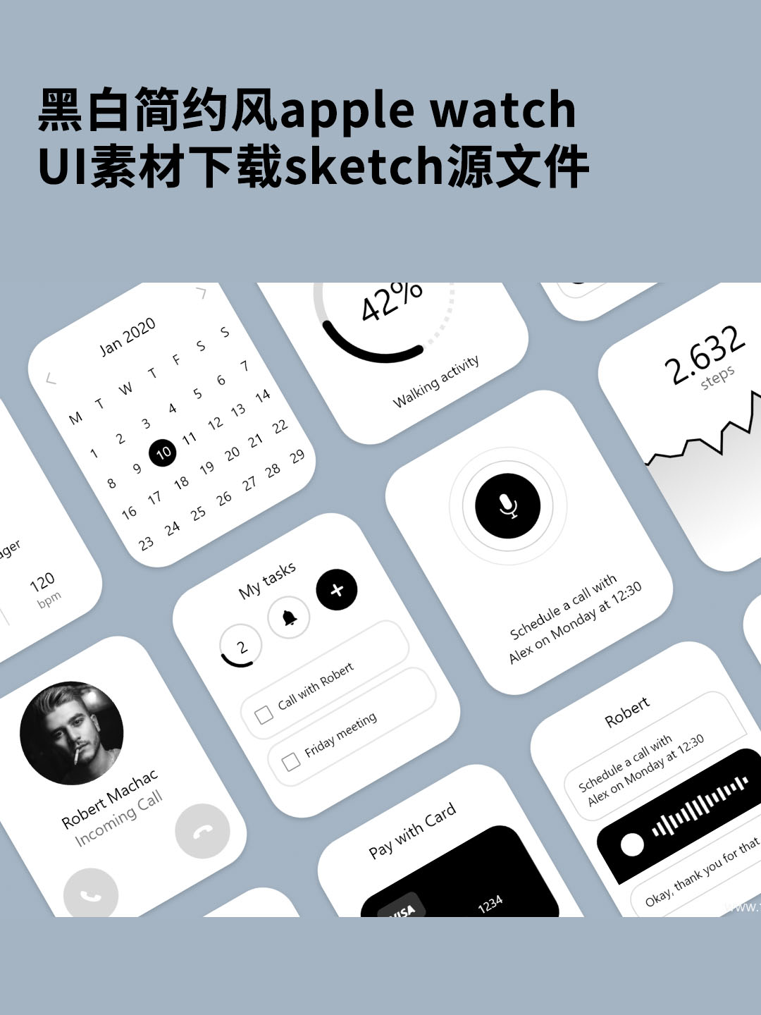 黑白简约风apple watch手表UI kit,手表UI源文件,UI素材下载sketch源文件