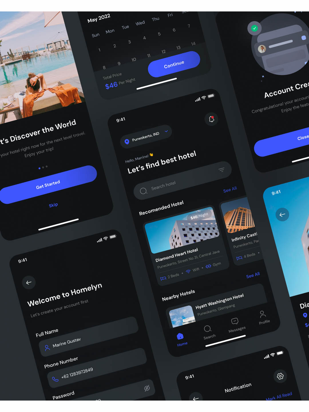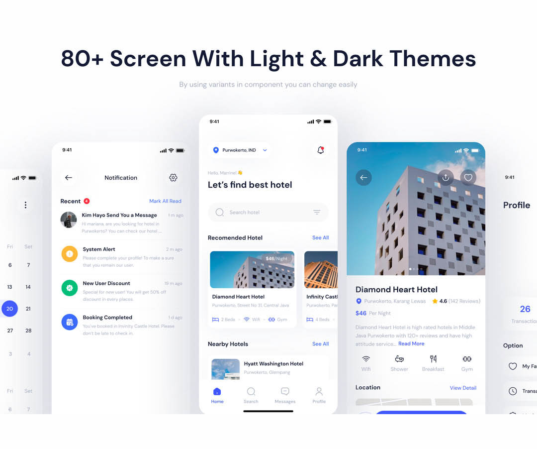 Hotelyn 是一款酒店预订移动应用程序 UI 套件,具有 80+ 高品质页面,易于使用,设计简洁、整洁和现代。Figma 文件中可用的 Light & Dark 主题。