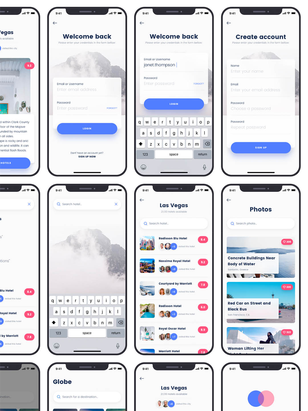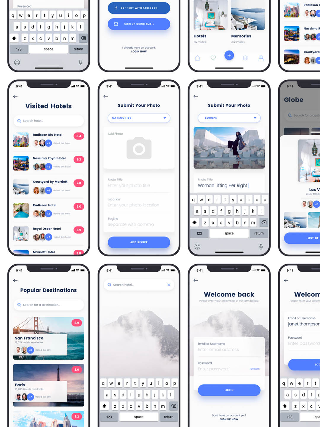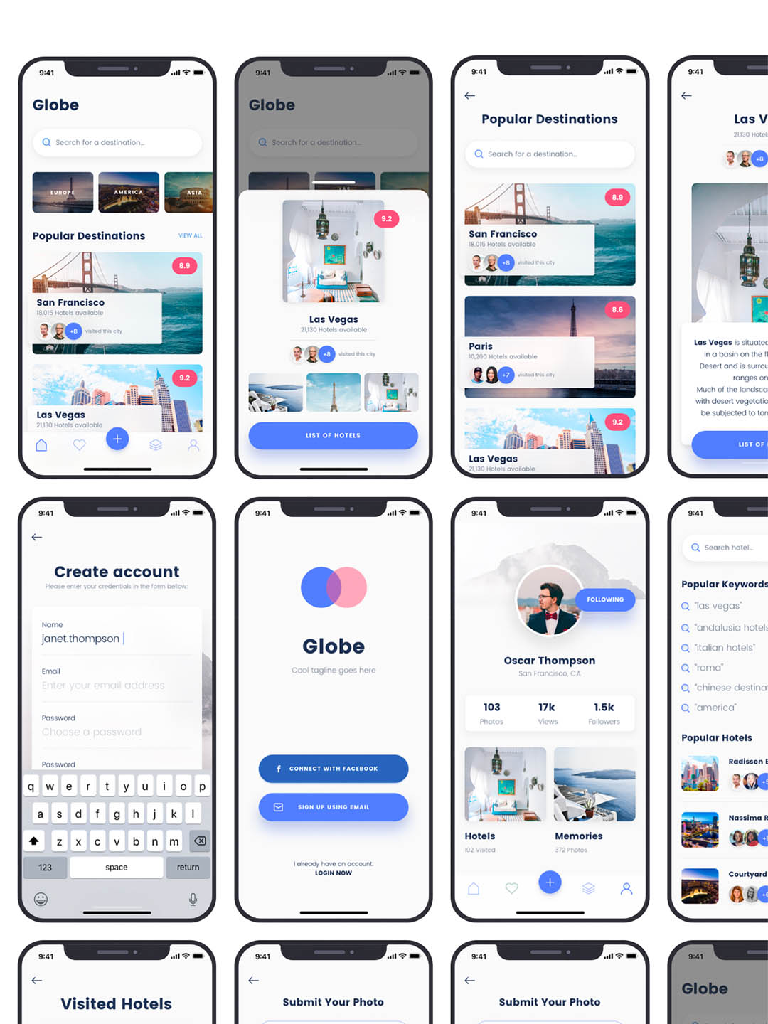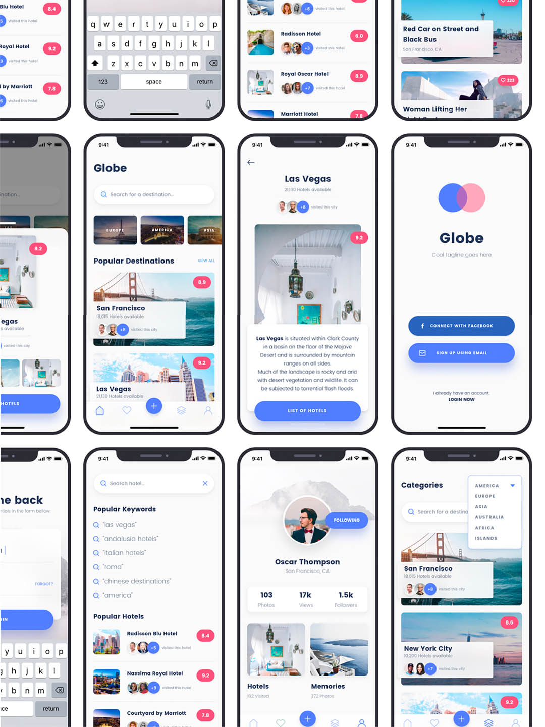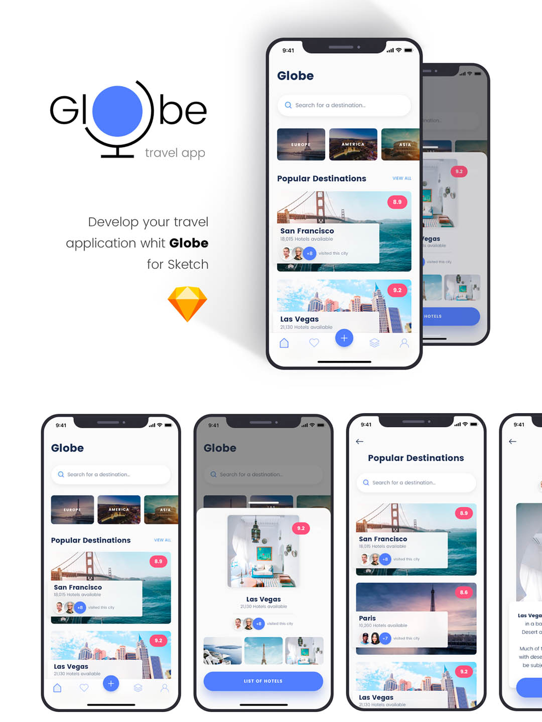 使用 Sketch 的“Globe”开发您的旅行应用程序。19 个页面 - 制作精美的移动设计视图。Free Font - 基于 Poppins 字体系列的排版。