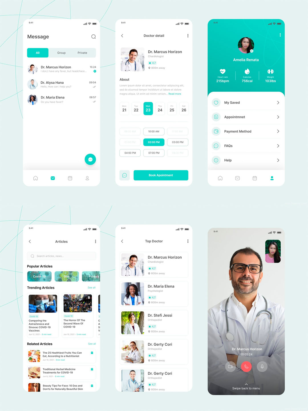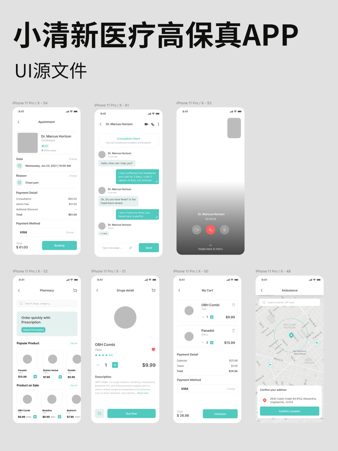 15页绿色小清新医疗APP、在线问诊APP UI高保真素材 figma,XD,PSD源文件辨率:375*812