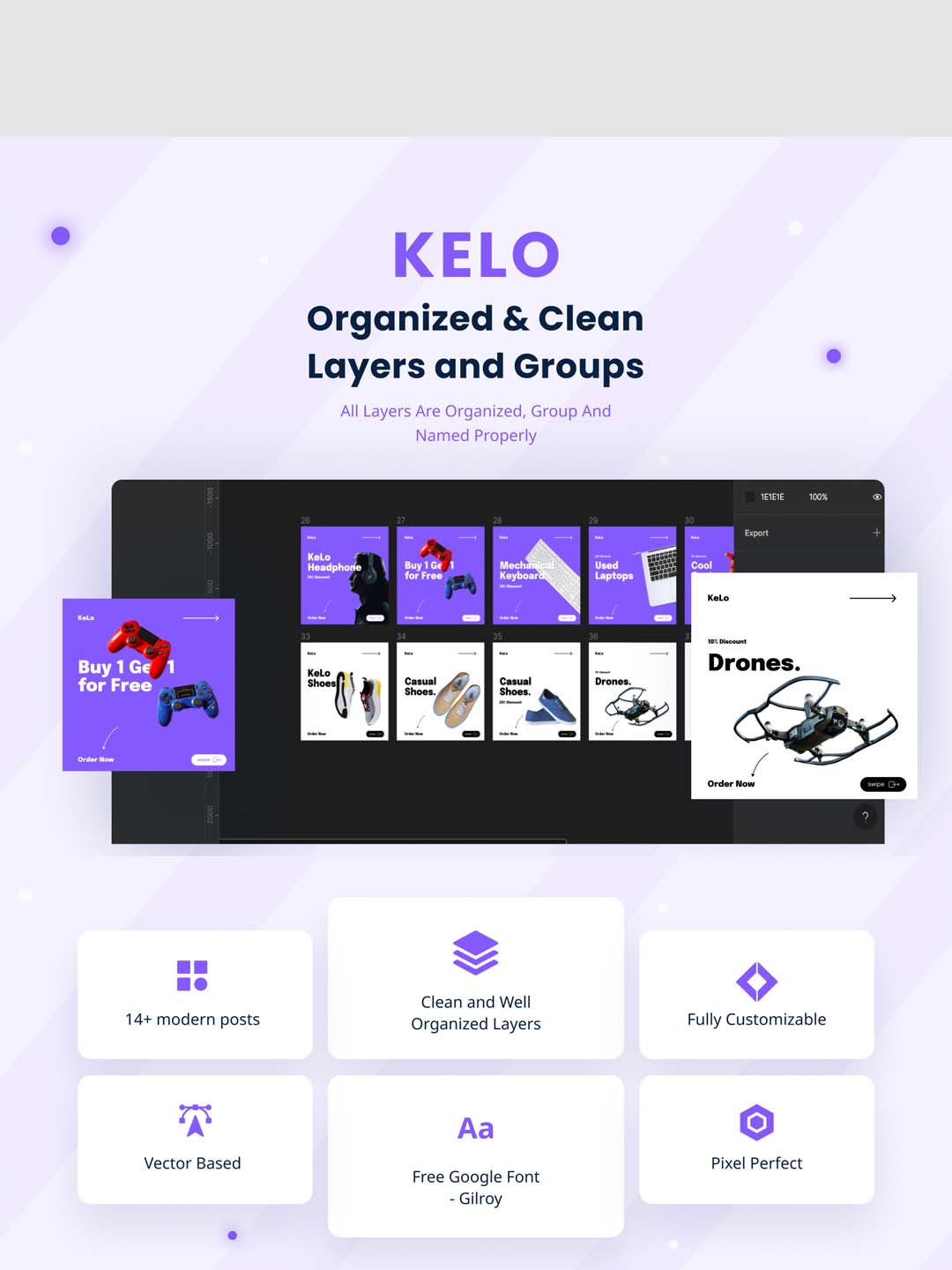 KELO 是一款优质的社交媒体设计工具包,适用于帖子、轮播和广告,具有 14 种以上的 HQ 设计,并且易于在 FIGMA Designs 中使用,这些设计是用 Love 制作的,更专注于品牌和在线形象。