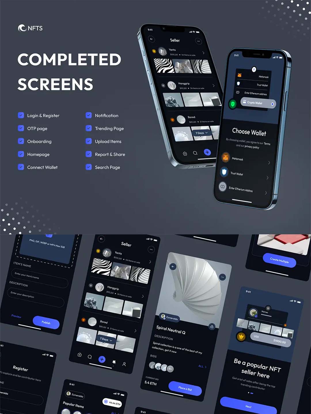 简约轻量白色/暗色两套风格NFT平台app UI资源素材套件分享