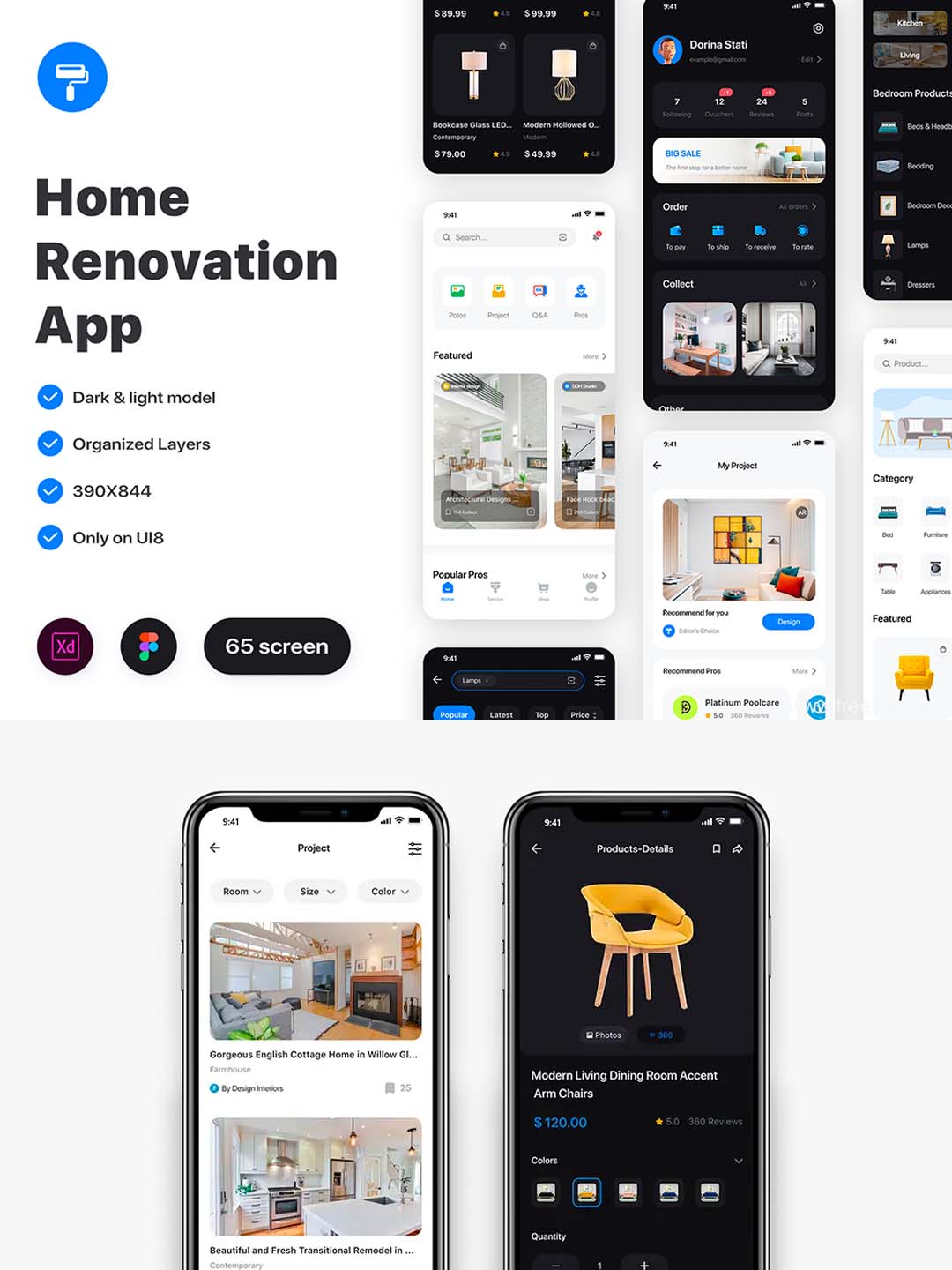 一套清新风格家居装修App应用程序、家居电商UI设计UI套件fig,xd源文件