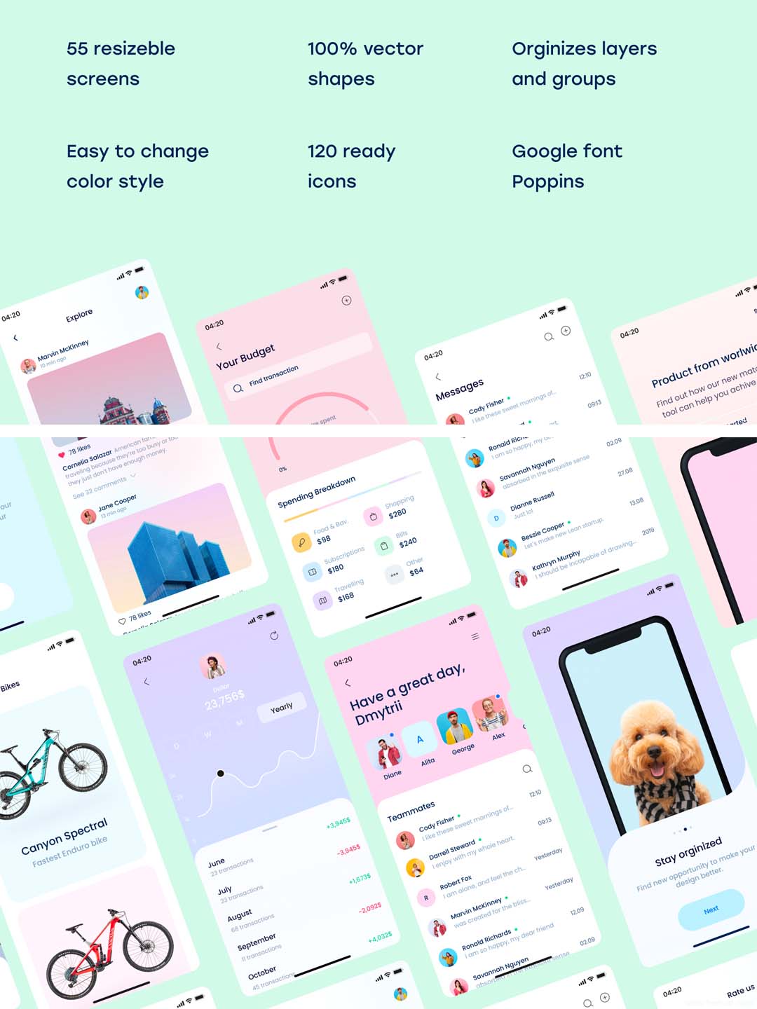 它旨在加快您的创作过程,拥有超过 55 个精美的屏幕。它是用 Sketch 和 Figma 设计的视觉 iOS 风格指南,精心打造。设计简单而引人注目。它分为 11 个真正需要的类别:沟通、入职、成功与失败、订阅、评价应用程序、电子商务、旅行、登录、个人资料、日历、财务。