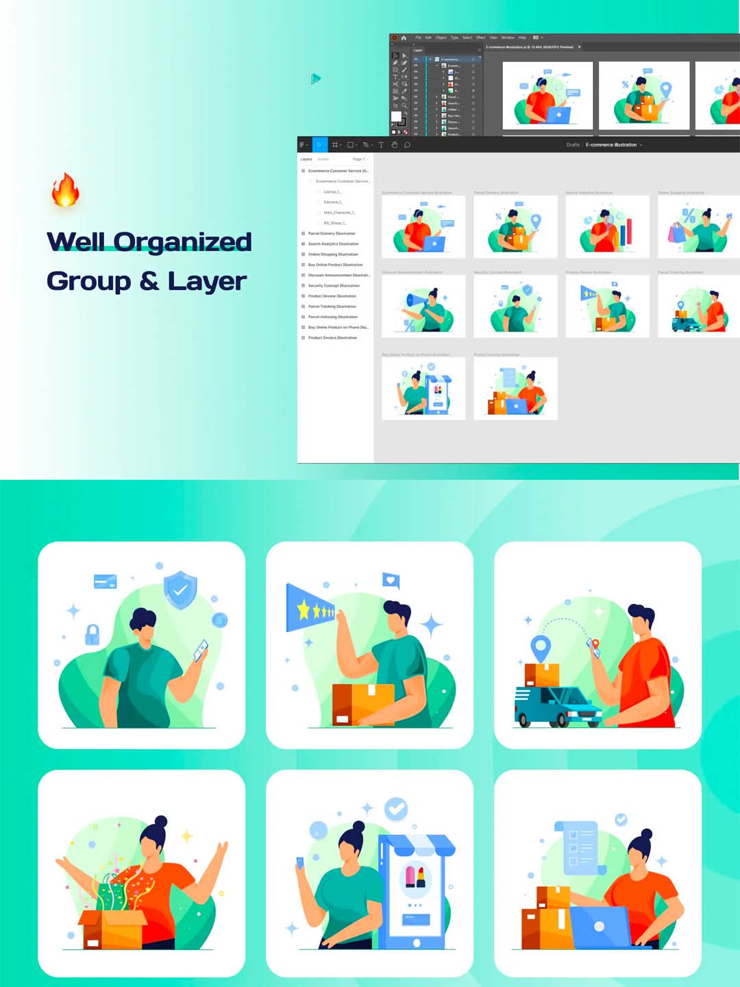 50个包含的所有插图都是完全可编辑的,我们包含源 Ai 文件和 SVG,可与任何矢量编辑软件一起使用