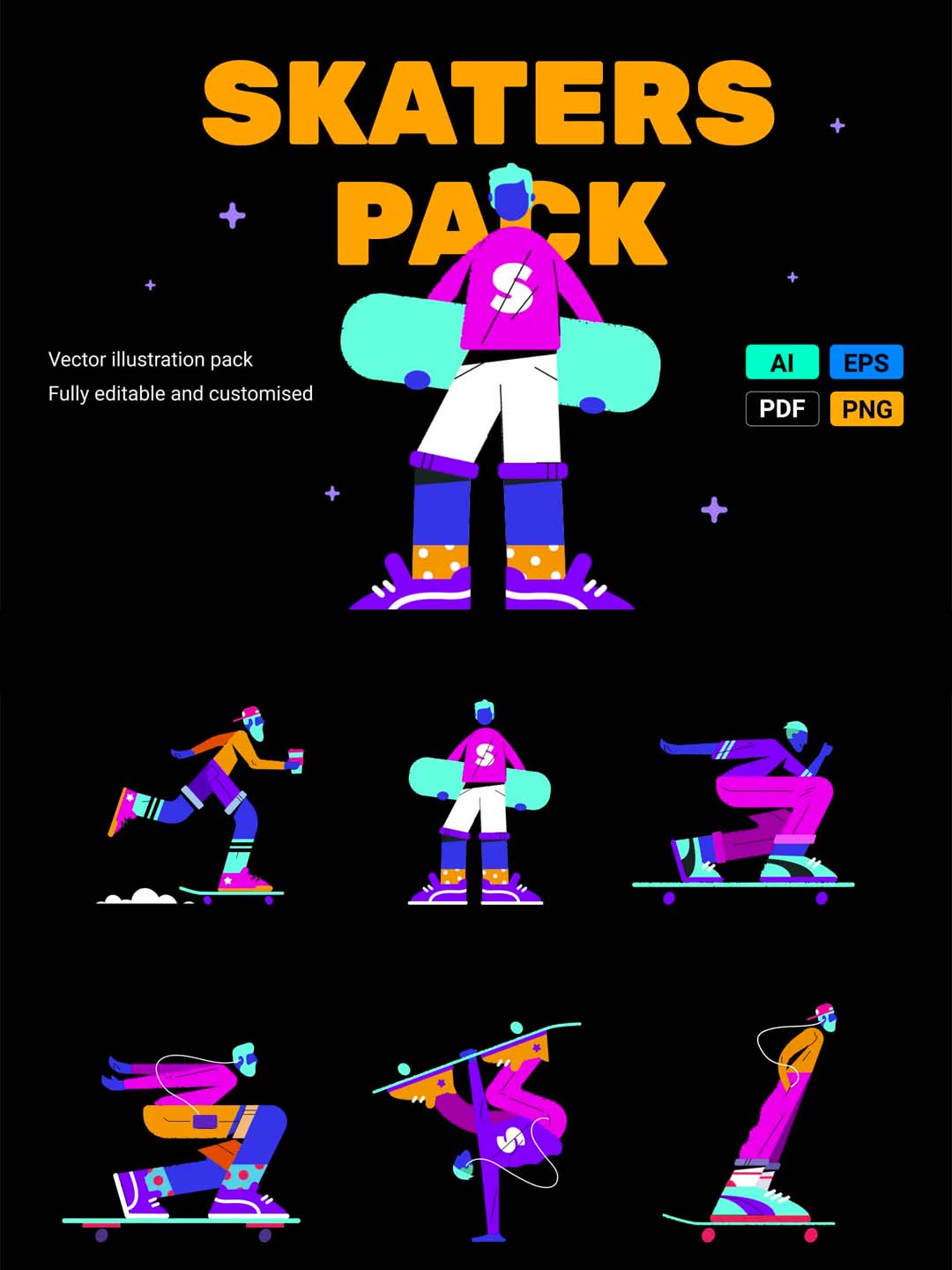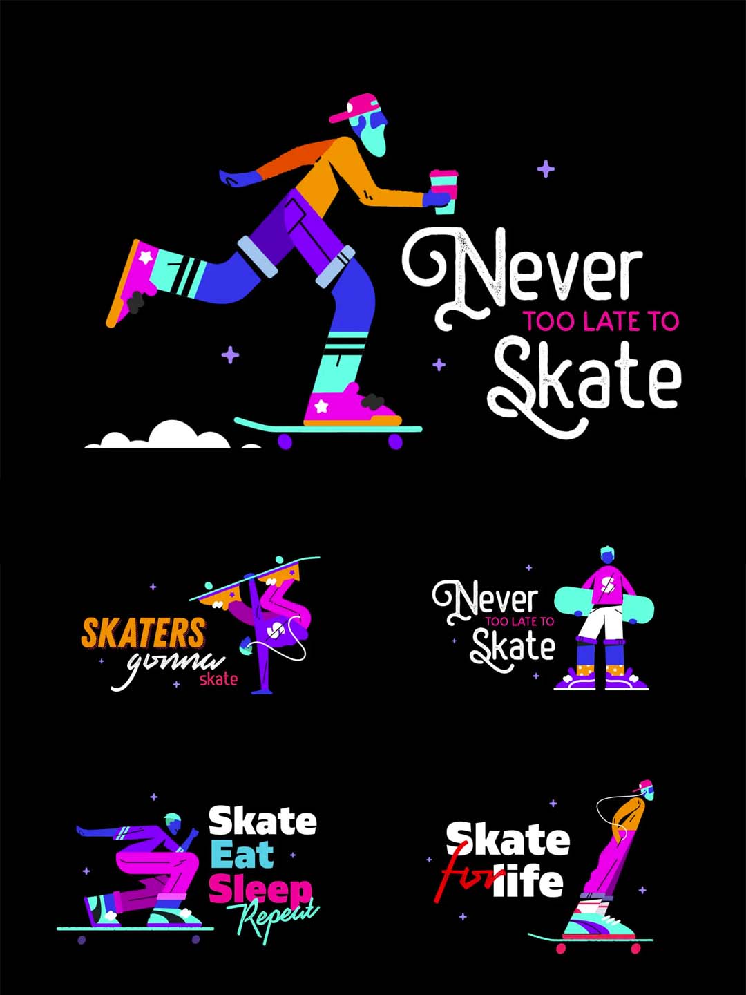 嘻哈风霓虹滑板运动员人物插画套装矢量ai源文件素材下载