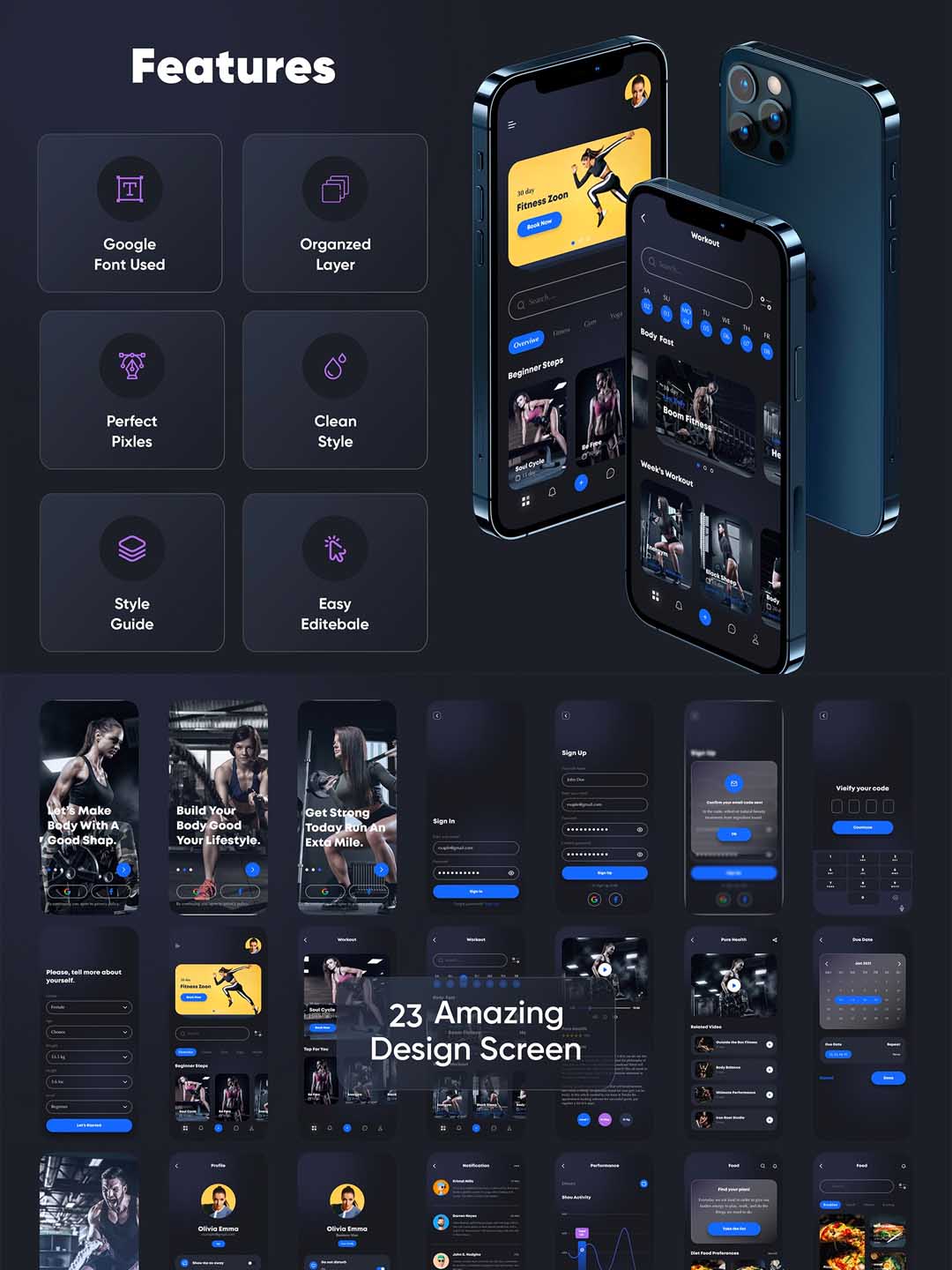 款运动健身类app UI KIT源文件下载,包含超过20个页面,黑白两种风格,ps、sketch、xd三种格式源文件