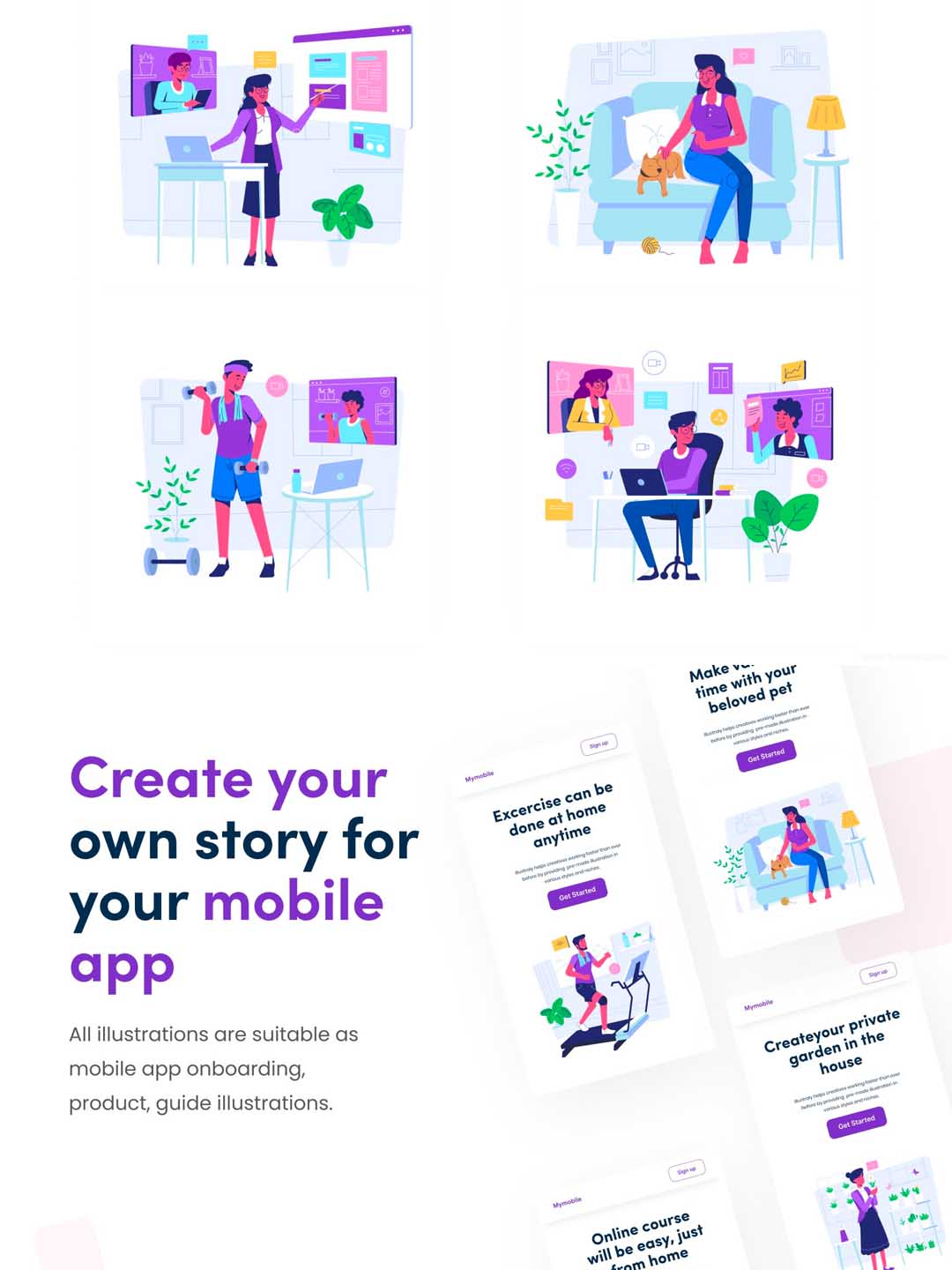 一套在家办公场景ui插画素材下载,办公场景插画,健身场景插画矢量UI插画素材源文件
