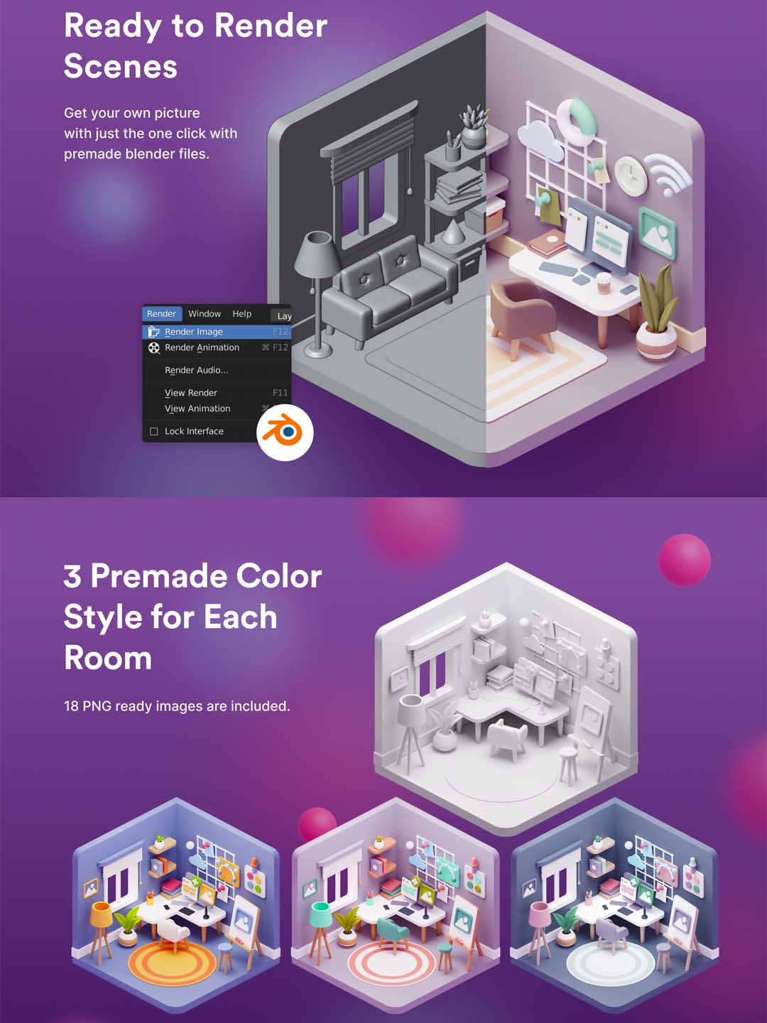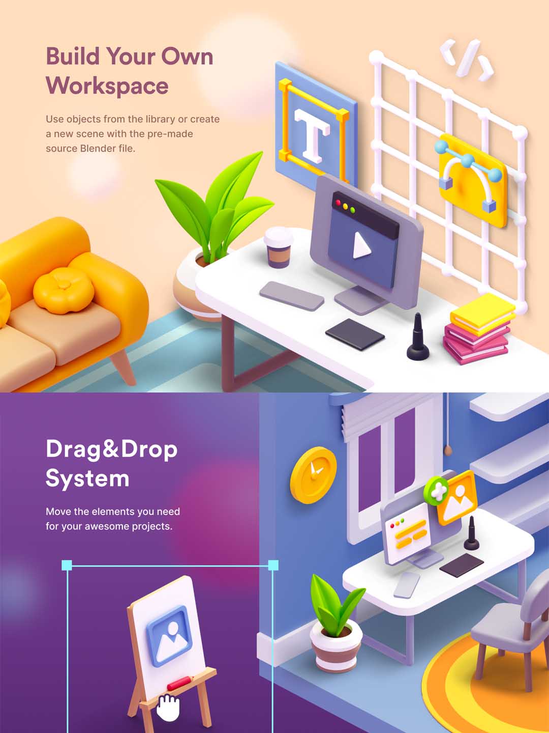 一套3D小房间插画系统源文件下载,矢量运营3D插画房间元素源文件下载
