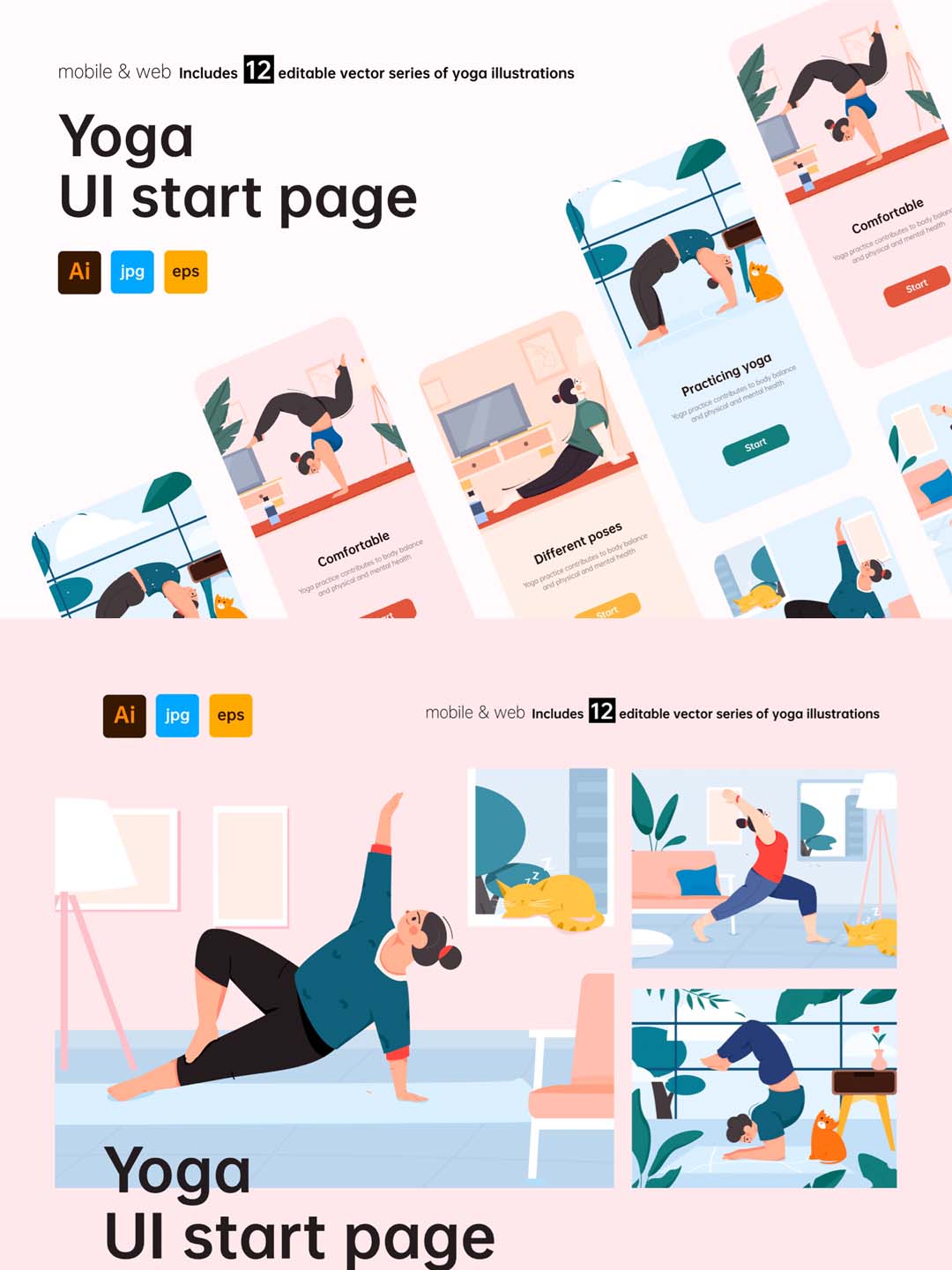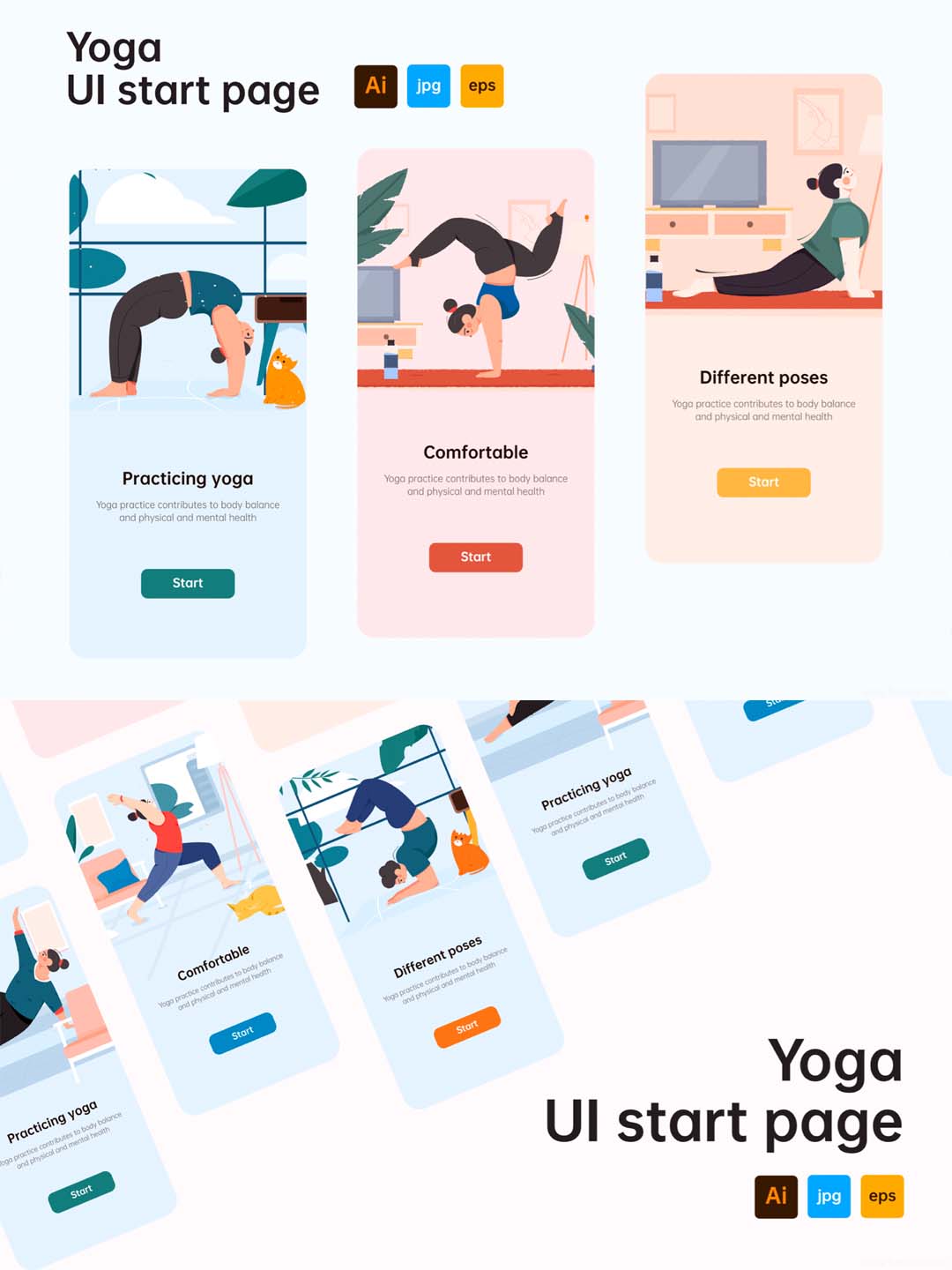一套运动健身矢量插画UI启动页下载,瑜伽健身矢量插画UI启动页ai源文件下载