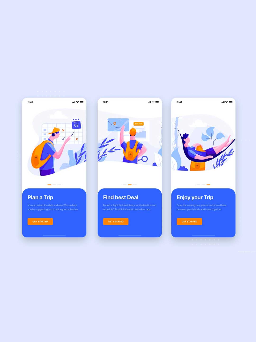 一套插画风旅游app引导页设计sketch源文件下载,旅游相关产品UI引导页源文件