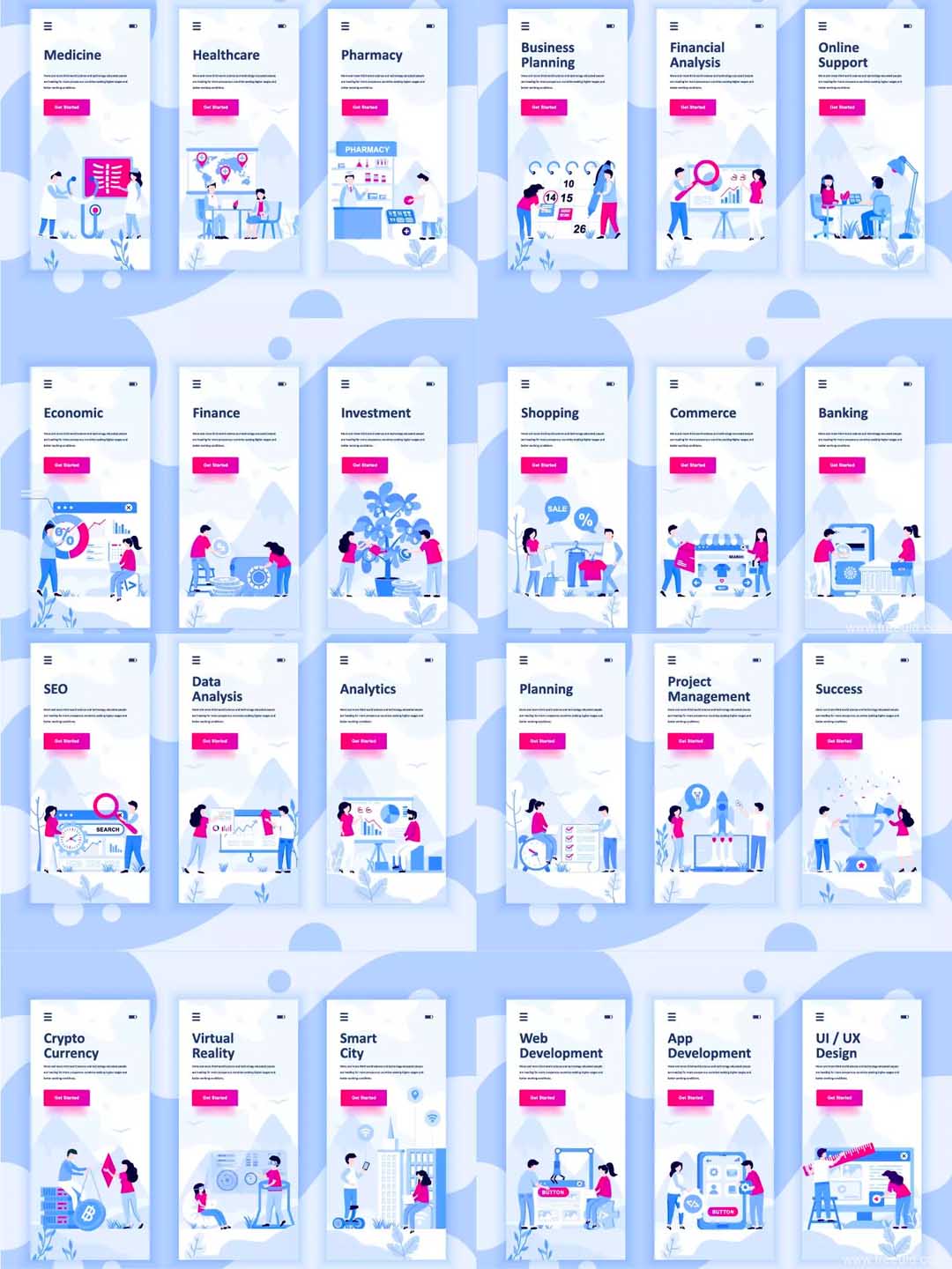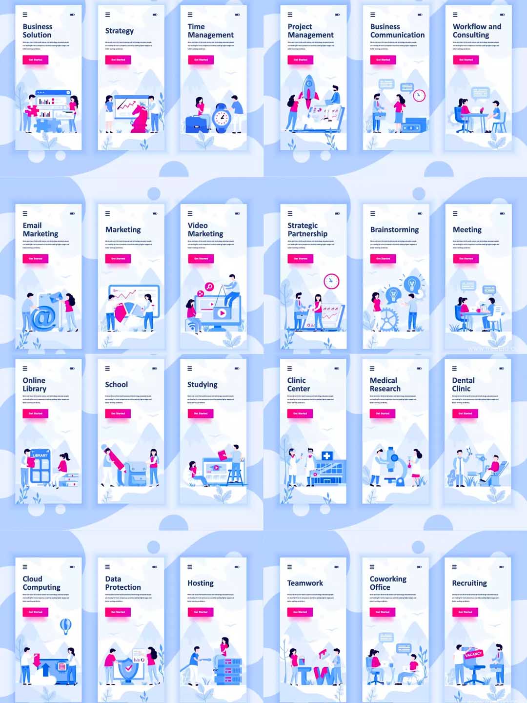 一套包含各行业的插画系统,插画启动页,UI插画引导页,行业插画ai源文件下载