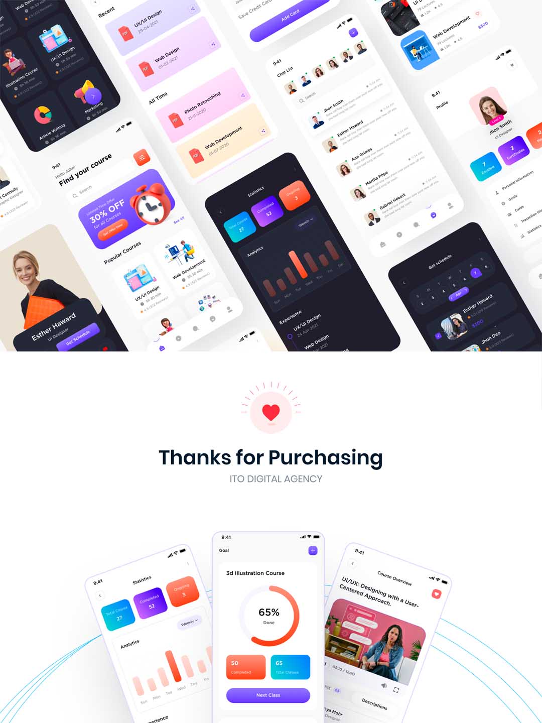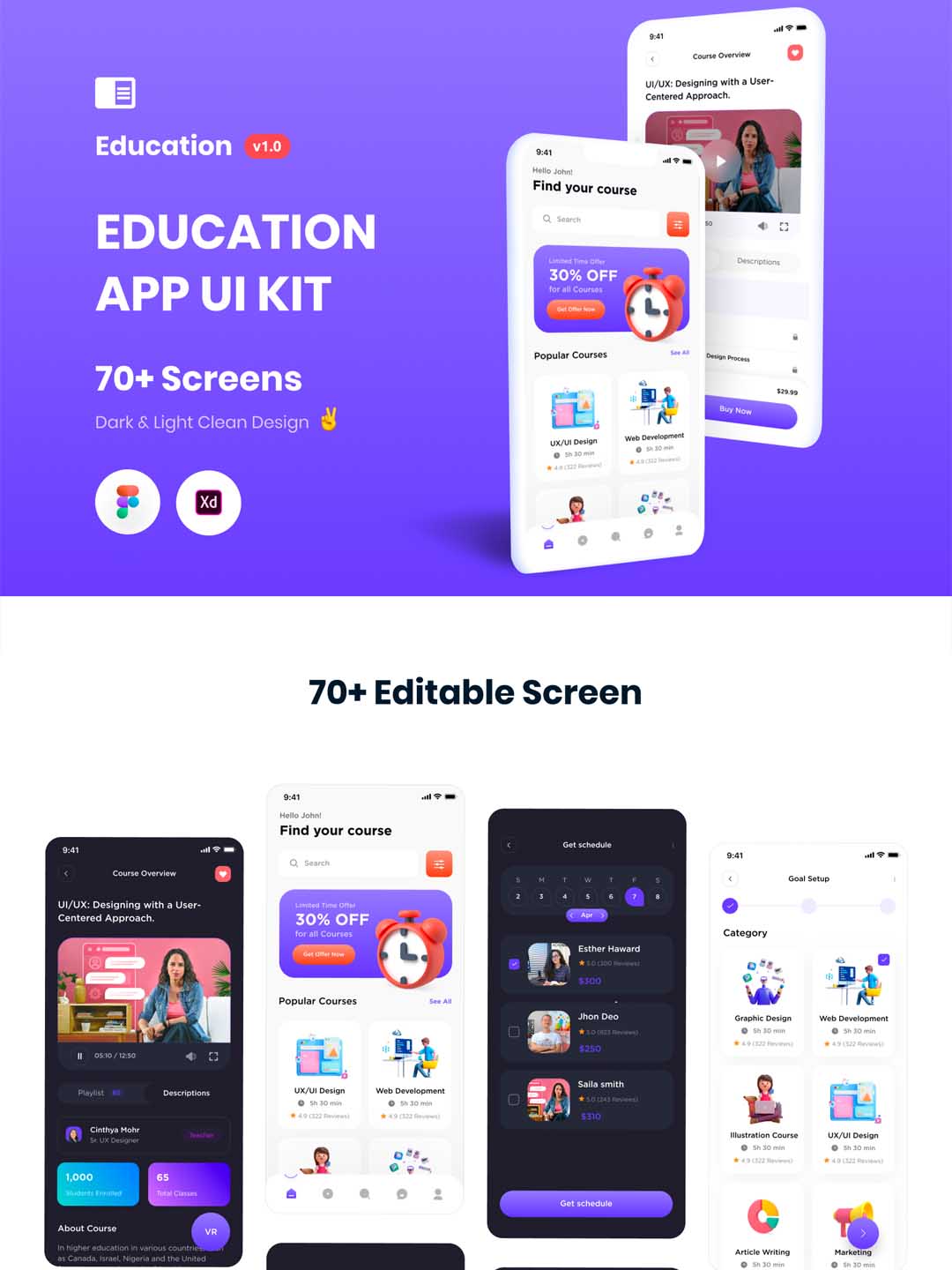 74页时尚流行风格的在线教育APP UI素材figma,xd格式