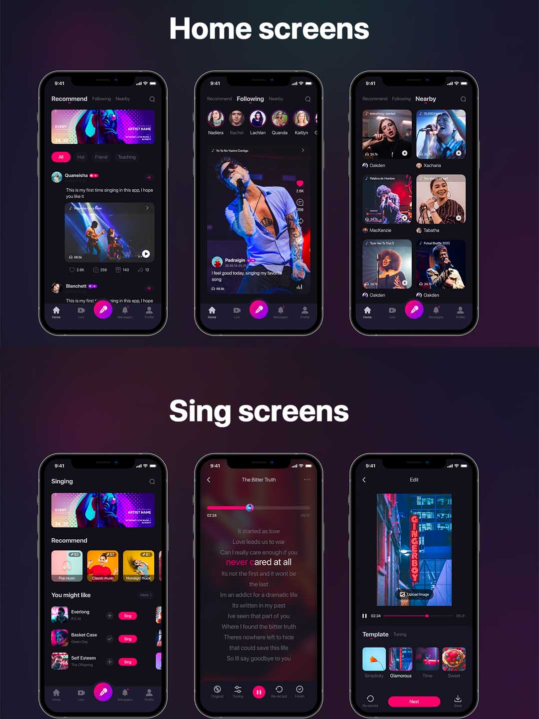 71页社交类K歌,短视频app UI设计sketch,xd,figma源文件