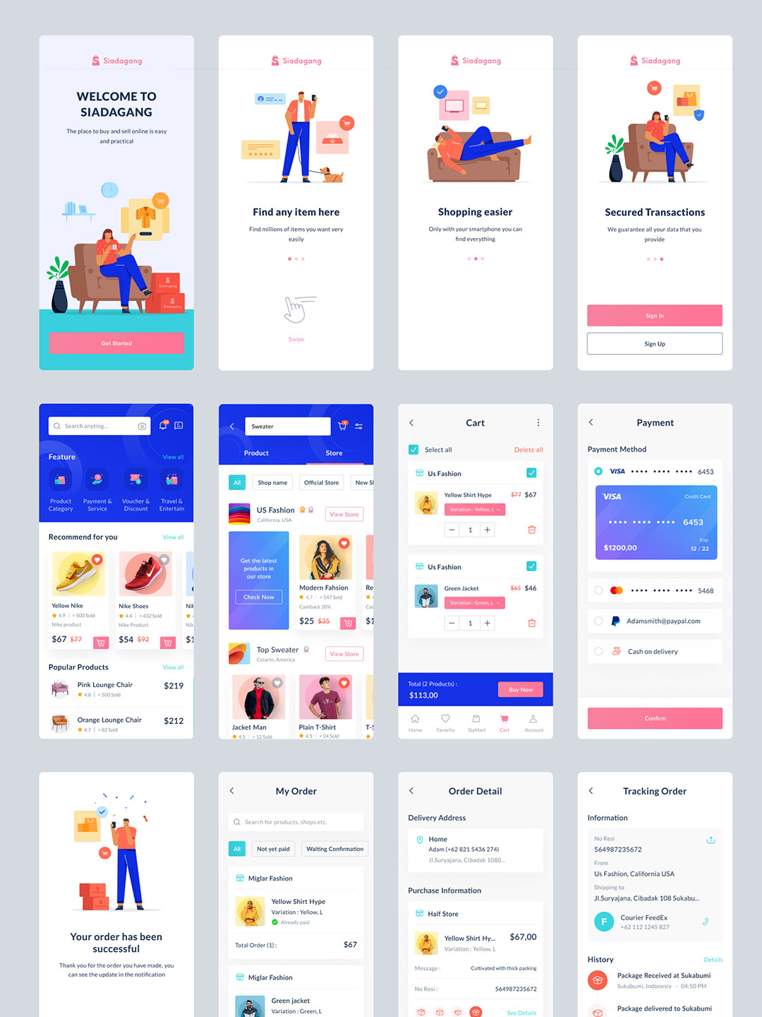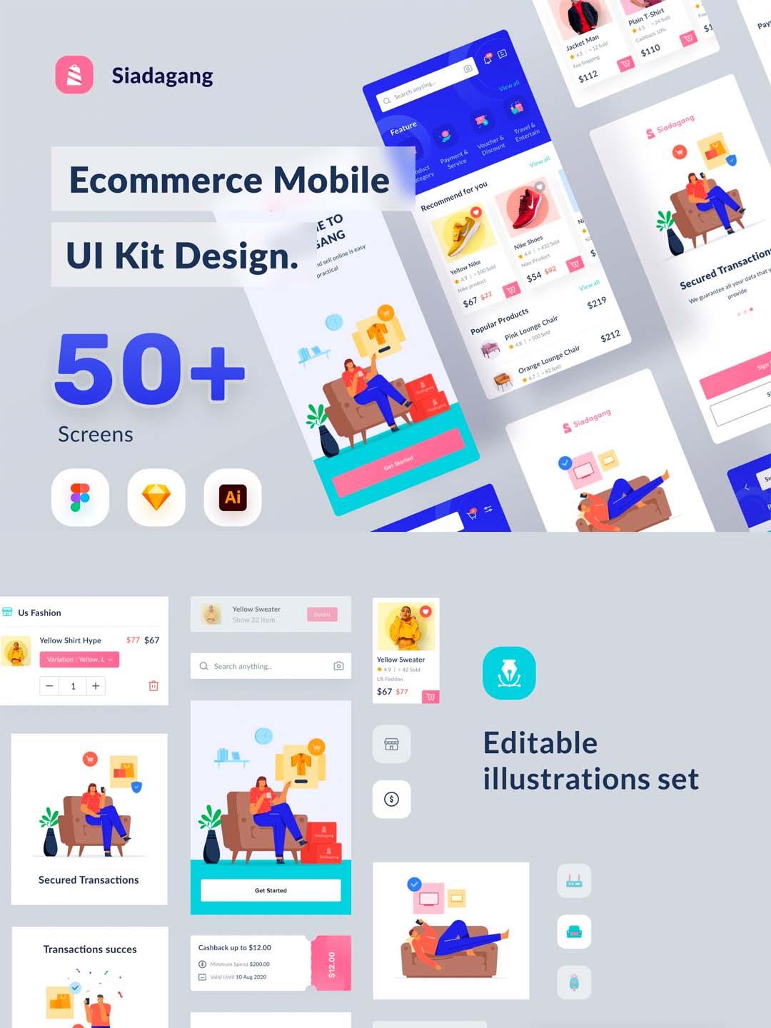 50页的插画风电商APP UI Figma, Sketch, Illustrator源文件