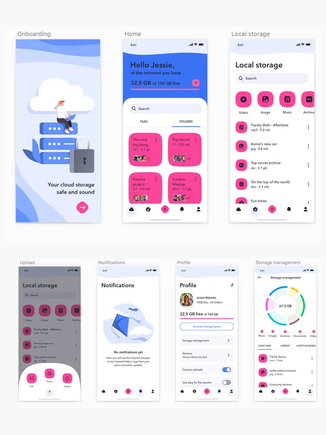 云存储应用程序。此sketch资源包含用于登陆、主页、本地存储和目录、上传首选项、通知、用户配置文件和存储管理的页面