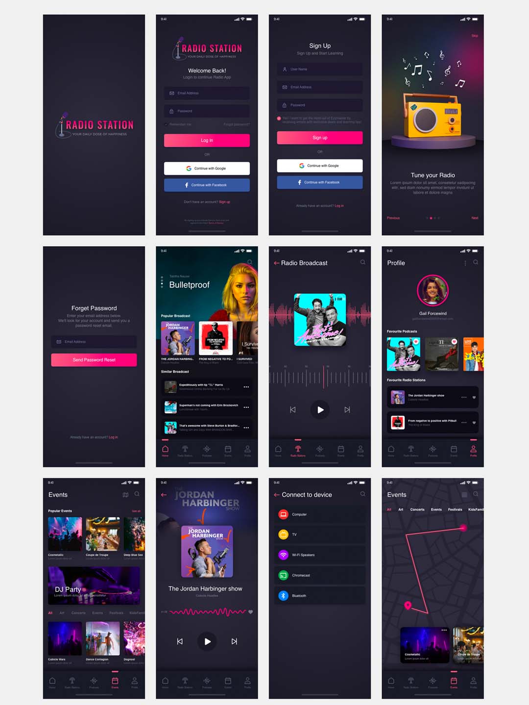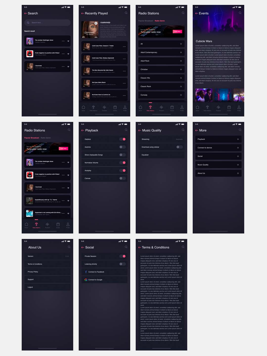 适用于 Adobe XD 的播客应用程序App UI 套件,适用于具有暗模式风格