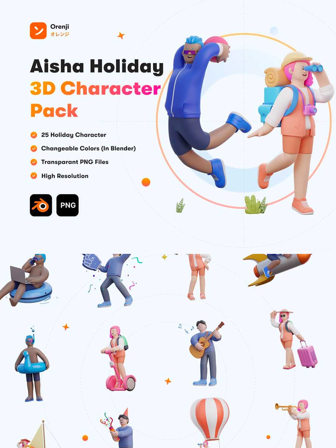 一套休闲娱乐适合户外+节日庆祝类的3D人物资产blener源文件