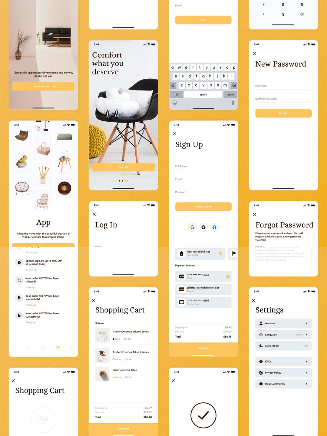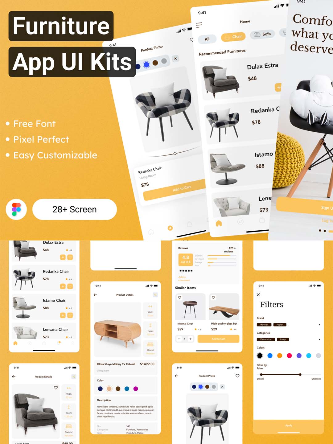 家具移动应用程序 UI 套件,家具APP 28+ 屏幕上设计的 Figma 源文件。