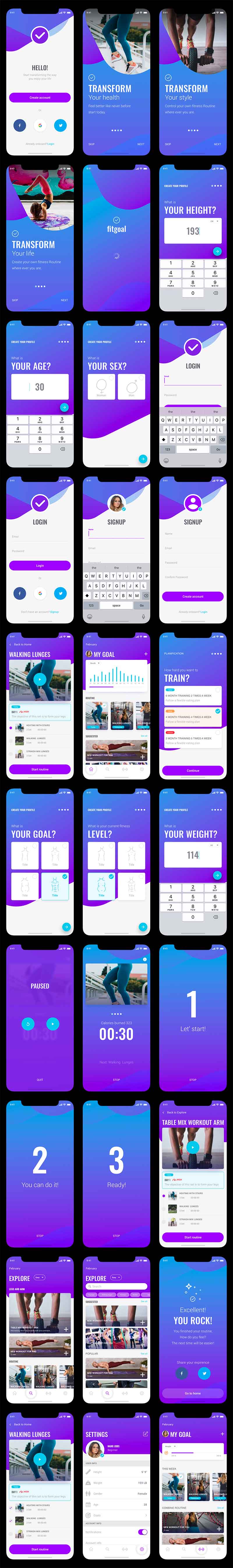 fitgoal UI 套件,sketch源文件包括 30 个屏幕、179 个组件和 26 个健身图标