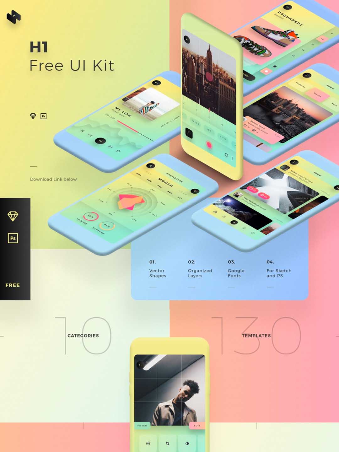 移动用户界面工具包 10 个类别。130 个模板。470 多个 UI 元素。 Sketch & Photoshop源文件