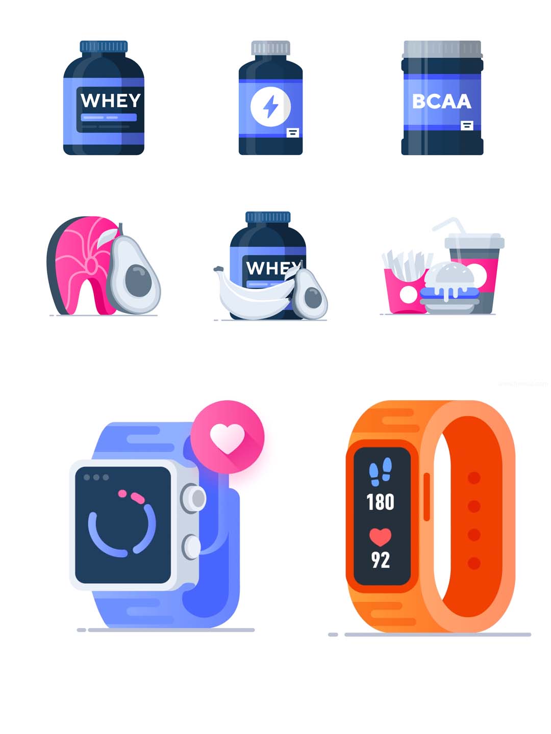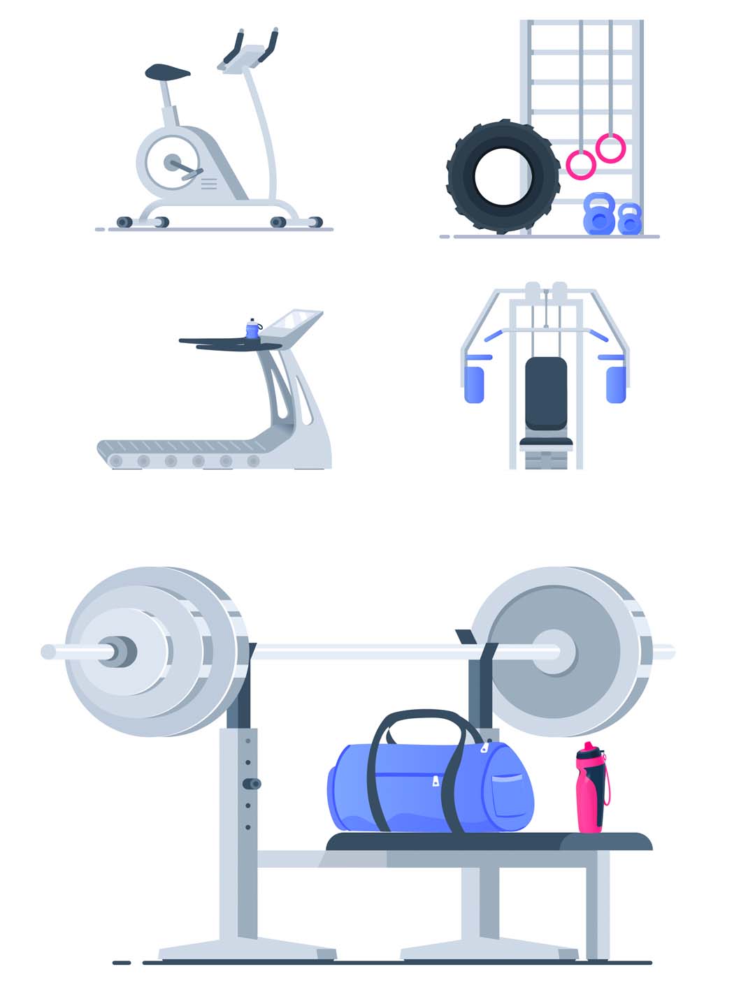 一套健身主题+健身器材相关的矢量插画、健身房矢量图标icon素材 sketch,fig,svg