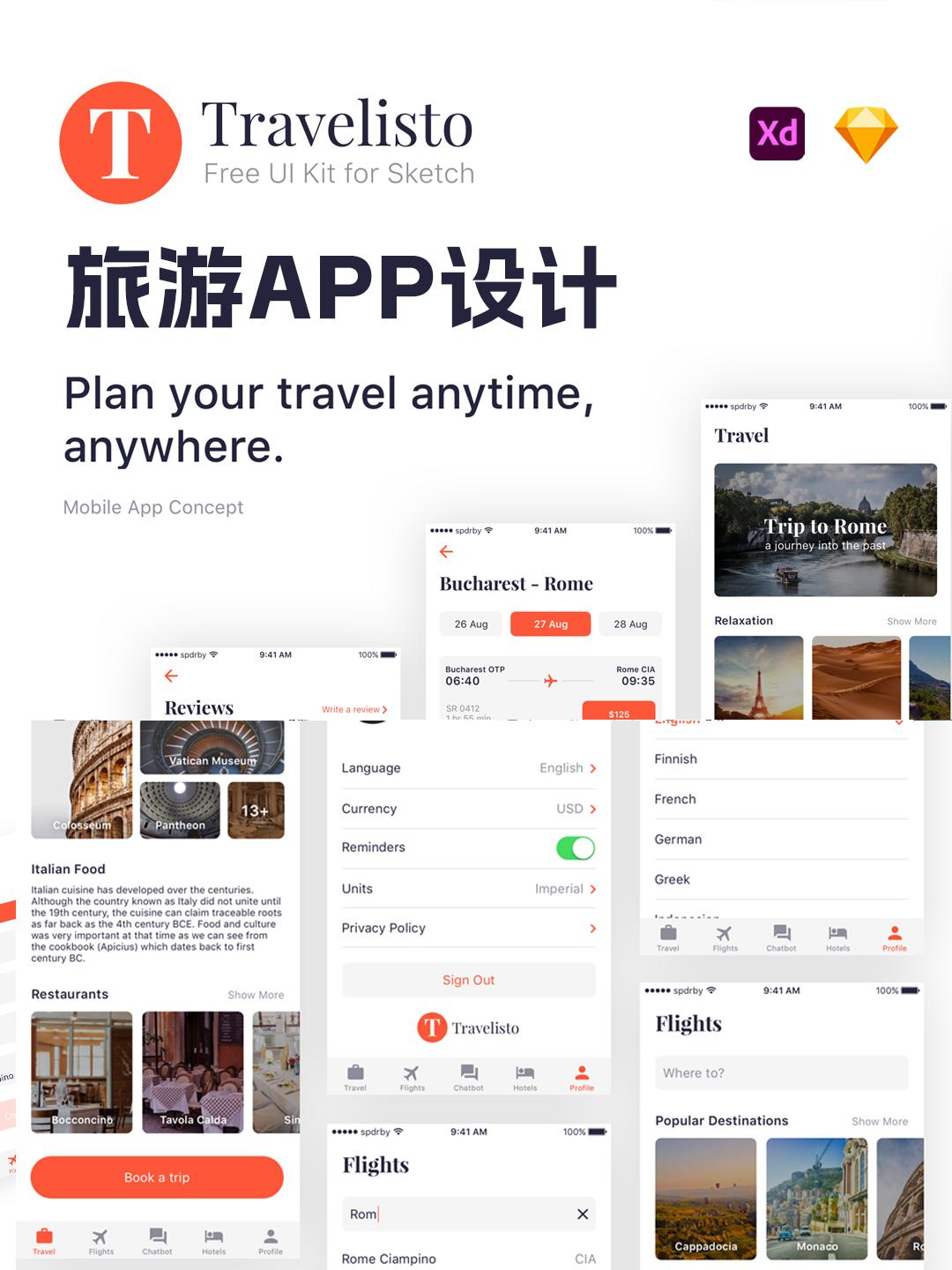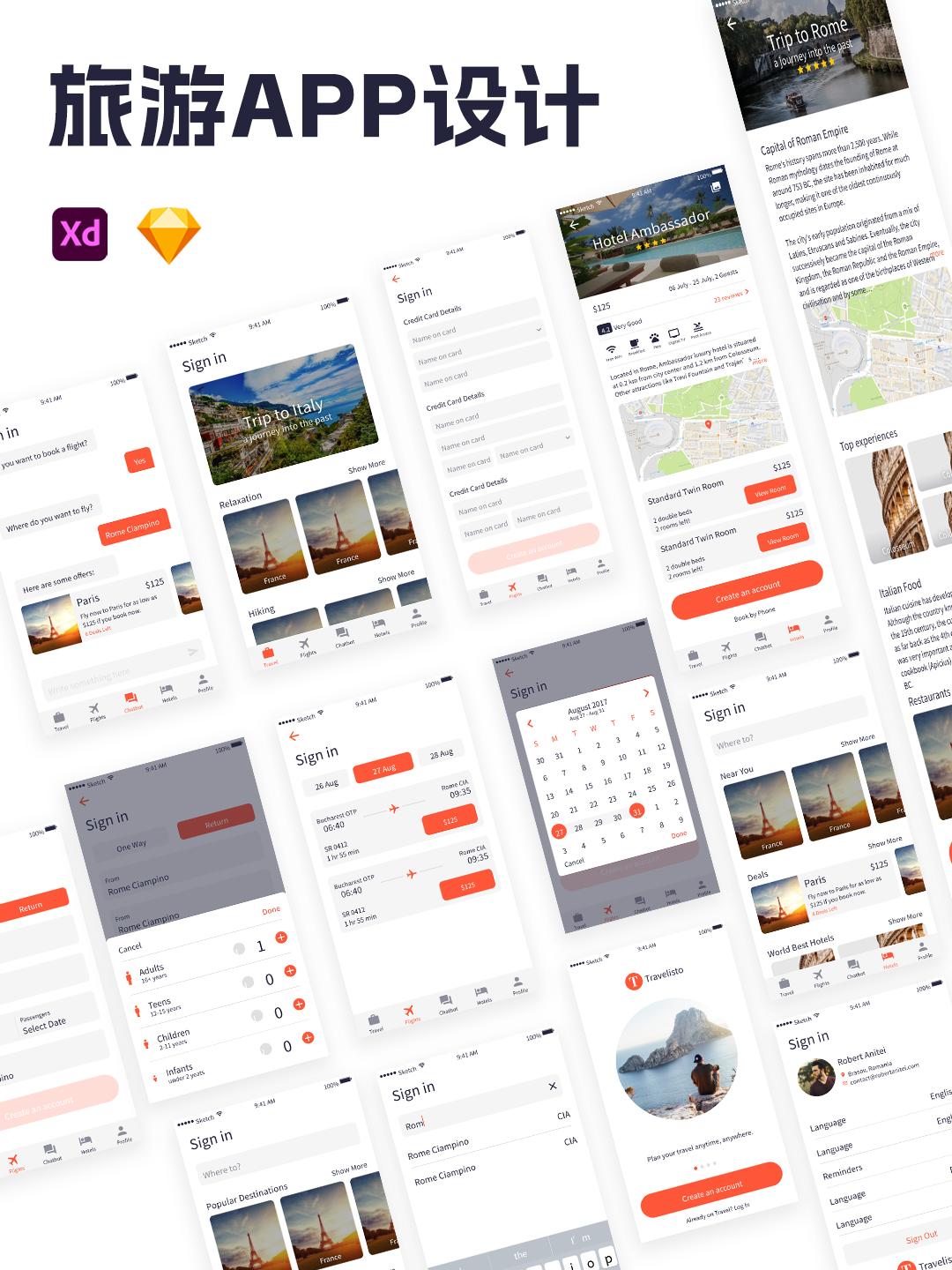 80页旅游行程规划、预订和探索APP设计sketch,xd,figma格式