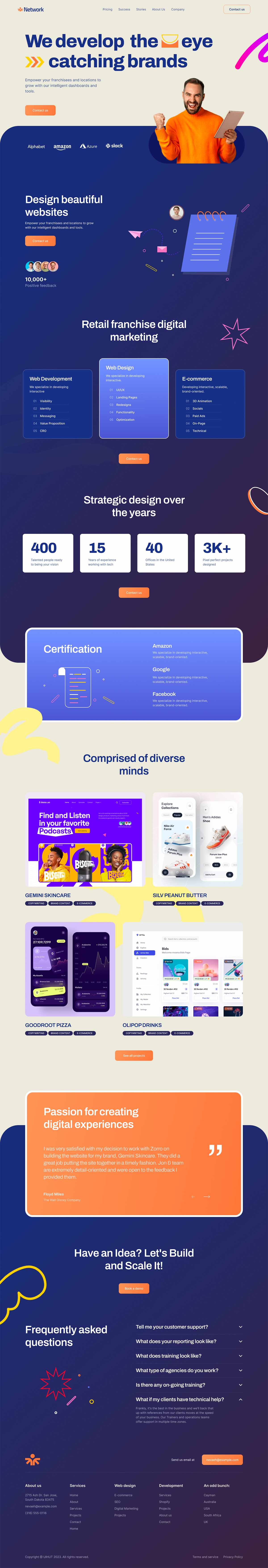 主页通常以突出的英雄形象或视频为特色,带有口号或价值主张,以快速传达该机构的核心服务和专业知识。接下来通常是一个网格或关键服务列表,每个服务都有一个简短的描述和一个到专用服务页面的链接以获取更多信息。导航菜单通常位于页面的顶部,网站的每个部分都有清晰简洁的标签,如“关于我们”、“服务”、“投资组合”、“博客”和“联系我们”。这个数字机构网站的UI设计优先考虑清晰的沟通,易于使用,以及现代和专业的美学。