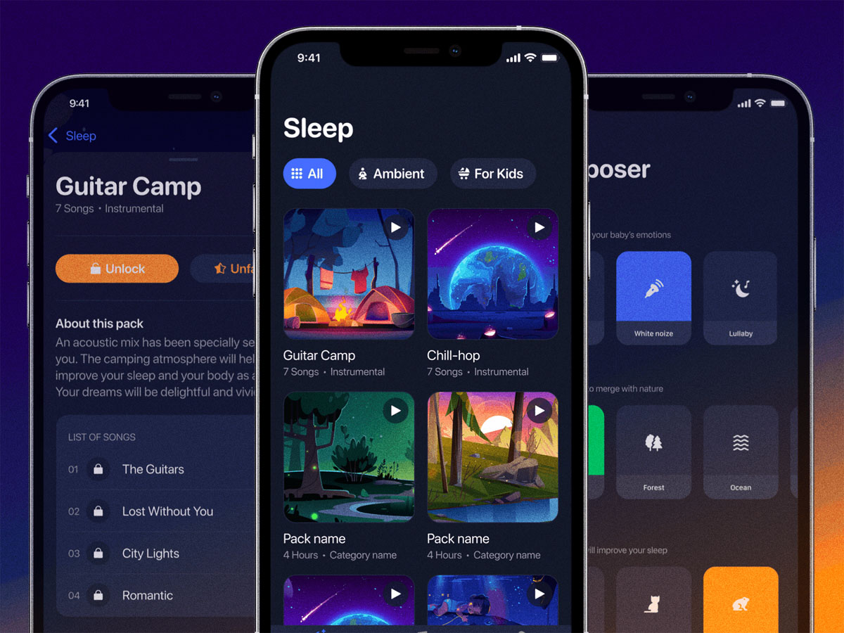 这是一款简单而精致的睡眠助手应用。从本质上讲,这款应用可以让用户在自然之声、雨声、童话故事、冥想音乐等声音中放松和入睡。这个资源包括3个屏幕的概念屏幕iOS和Android