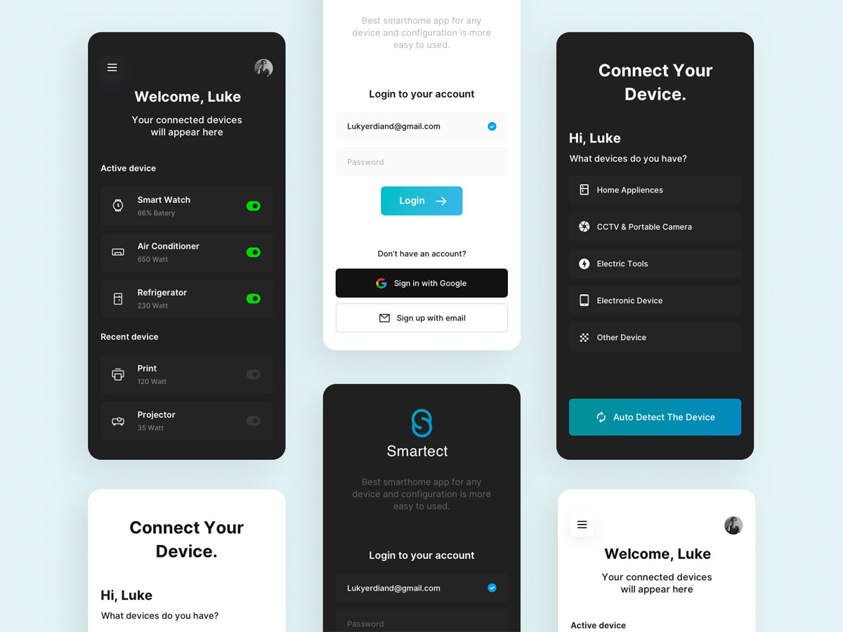 简单的移动屏幕与智能设备交互。这个资源包括3个屏幕在黑暗和光明模式:登录(谷歌/电子邮件注册),连接向导(自动检测设备),和设备仪表板(显示活动和最近的设备及其控件)。此资源是探索您自己的设备自动化应用程序想法的一个很好的起点。