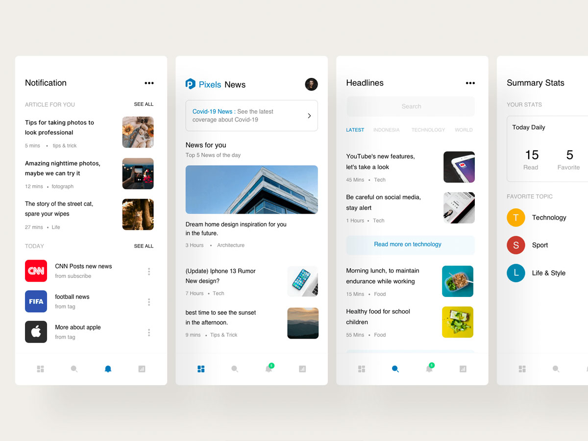 简单的移动应用程序的新闻和文章内置搜索和页脚工具栏/标签。该资源包括4个主要屏幕:主页(最新新闻/文章),头条,通知,摘要统计/最喜欢的主题