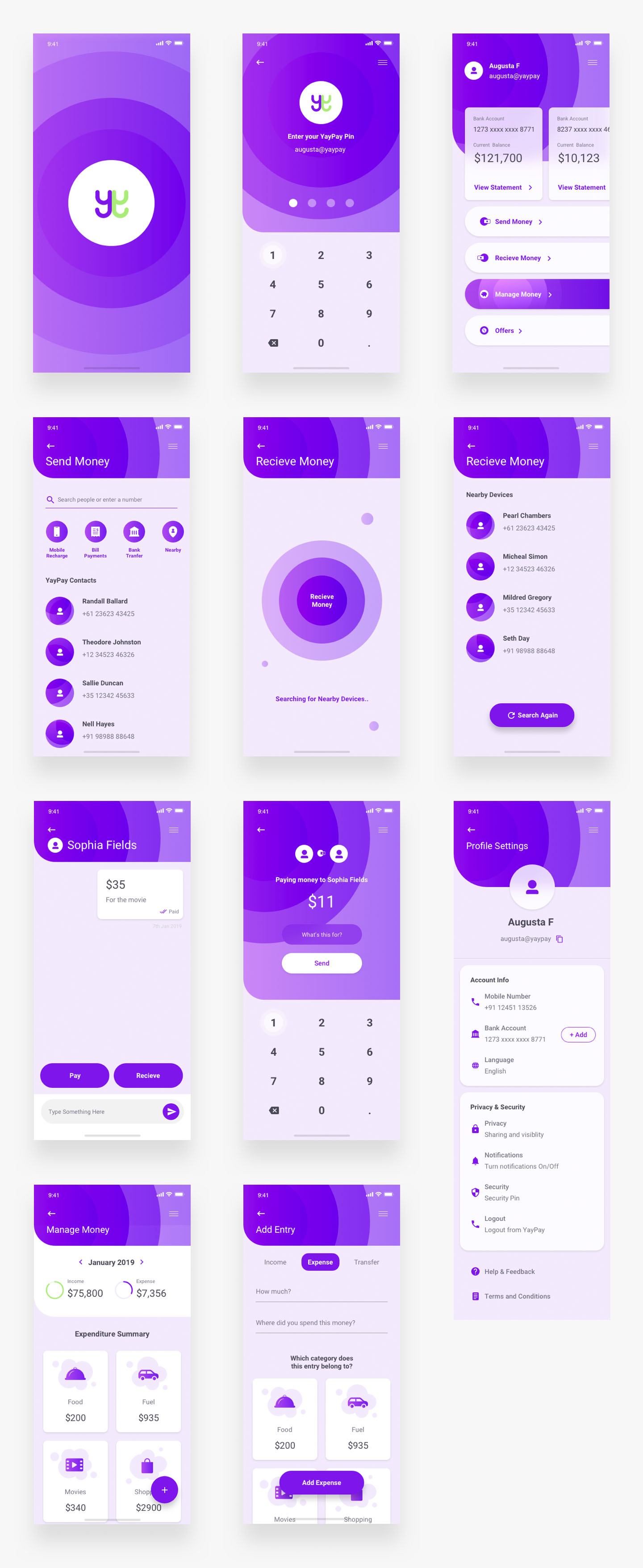 这有11个屏幕-欢迎,安全登录,家庭,发送资金,接收资金,搜索附近的设备,配置文件,联系聊天,支付资金,管理资金和添加费用。