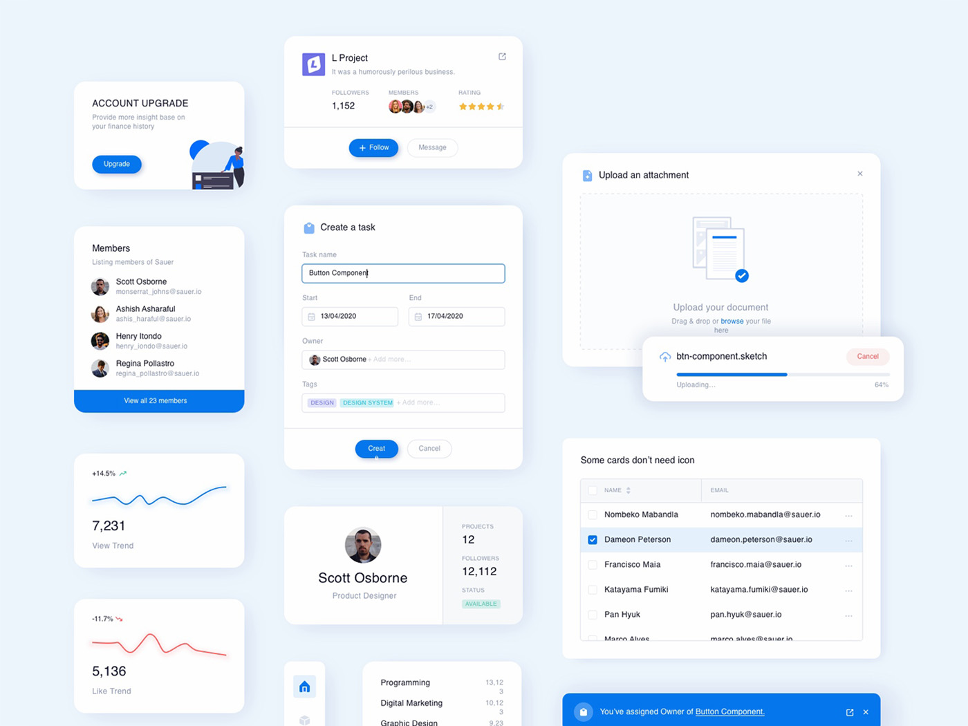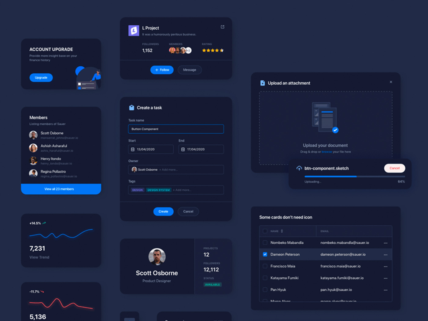 一组基于卡片的UI元素在黑暗和光明的主题:CTA,用户列表,配置文件,表单,上传,上传进度,快速配置文件,类别,经销商,侧导航,趋势,可排序表。