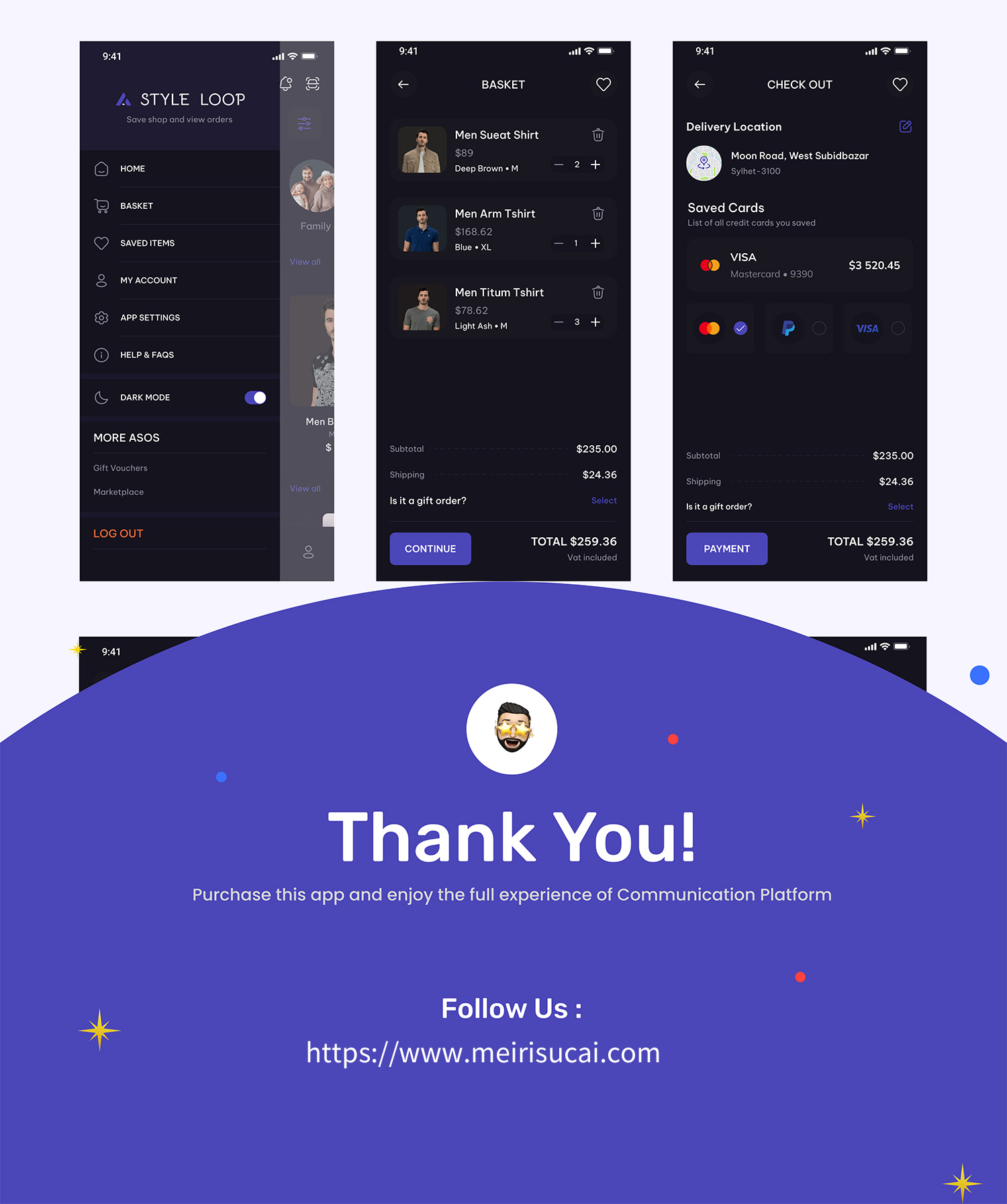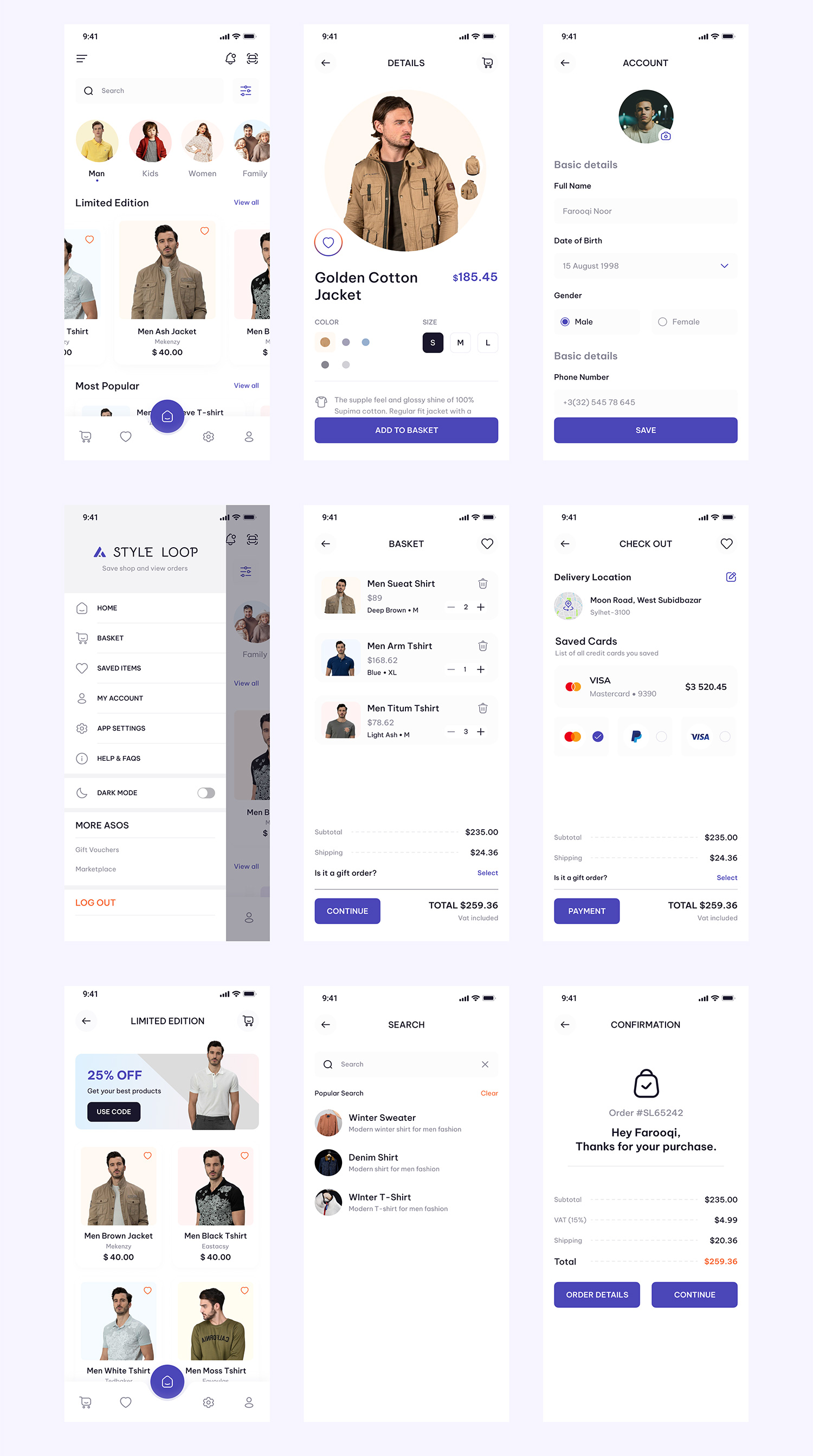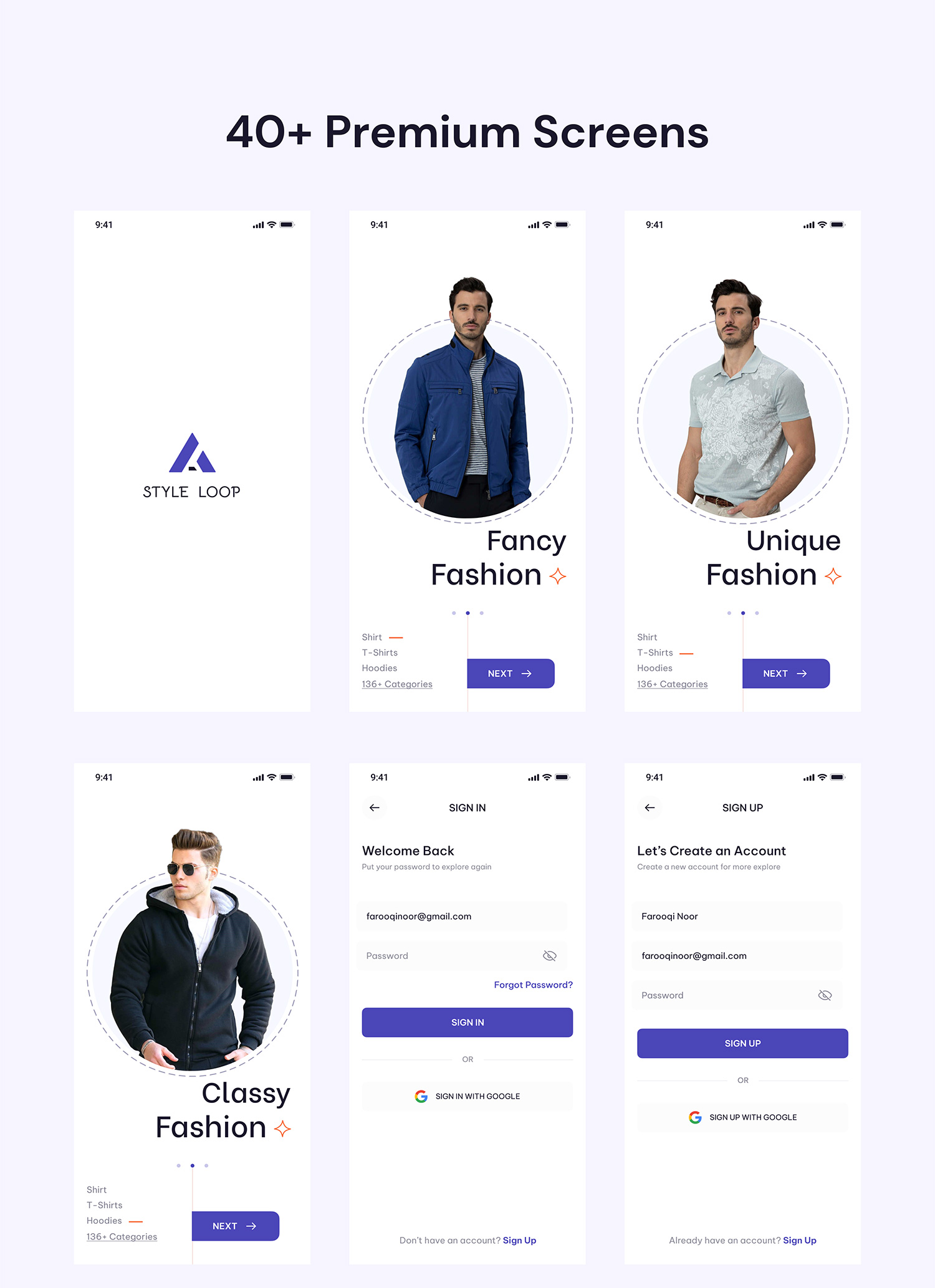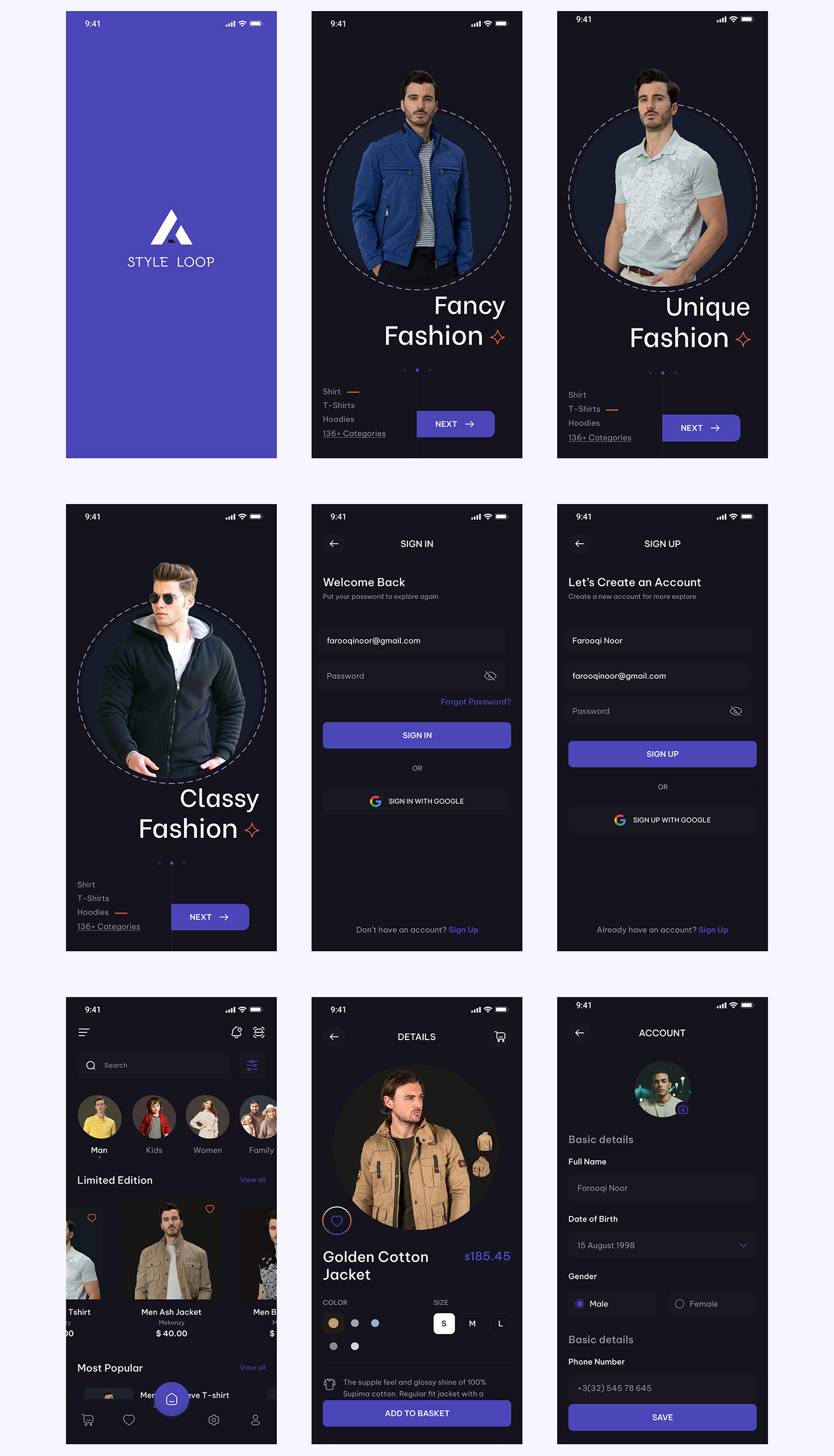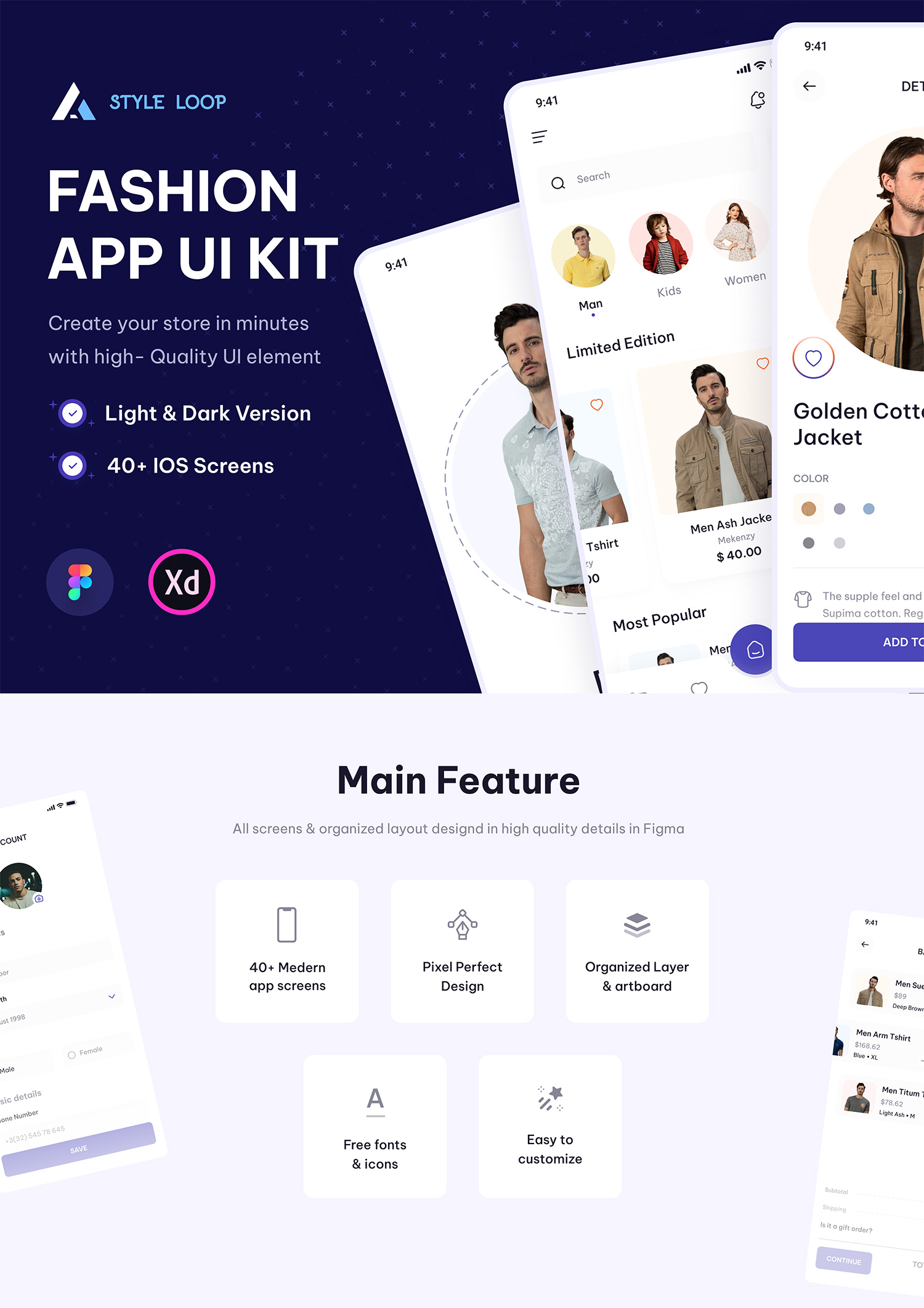 一款服装设计APP,包含40多个很棒的屏幕,兼容Figma和XD,sketch。