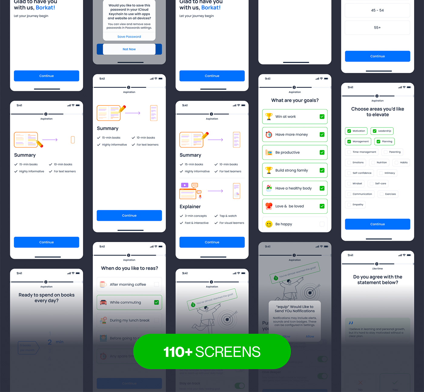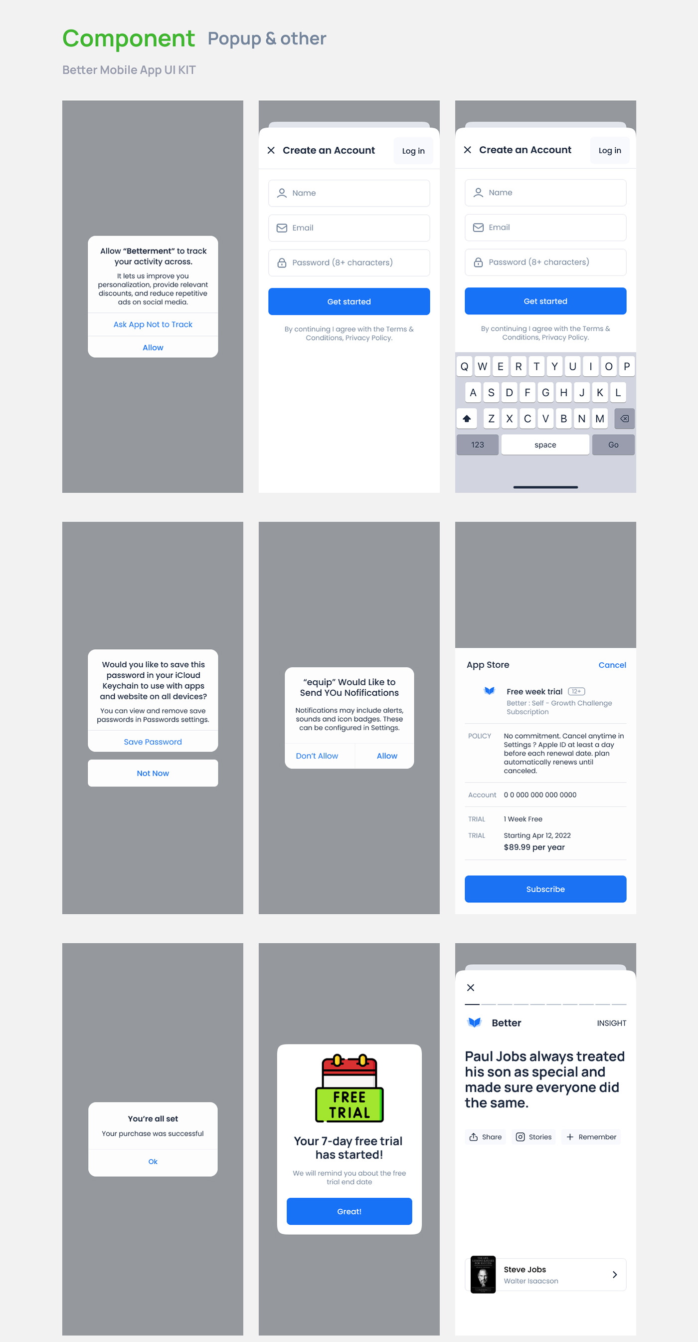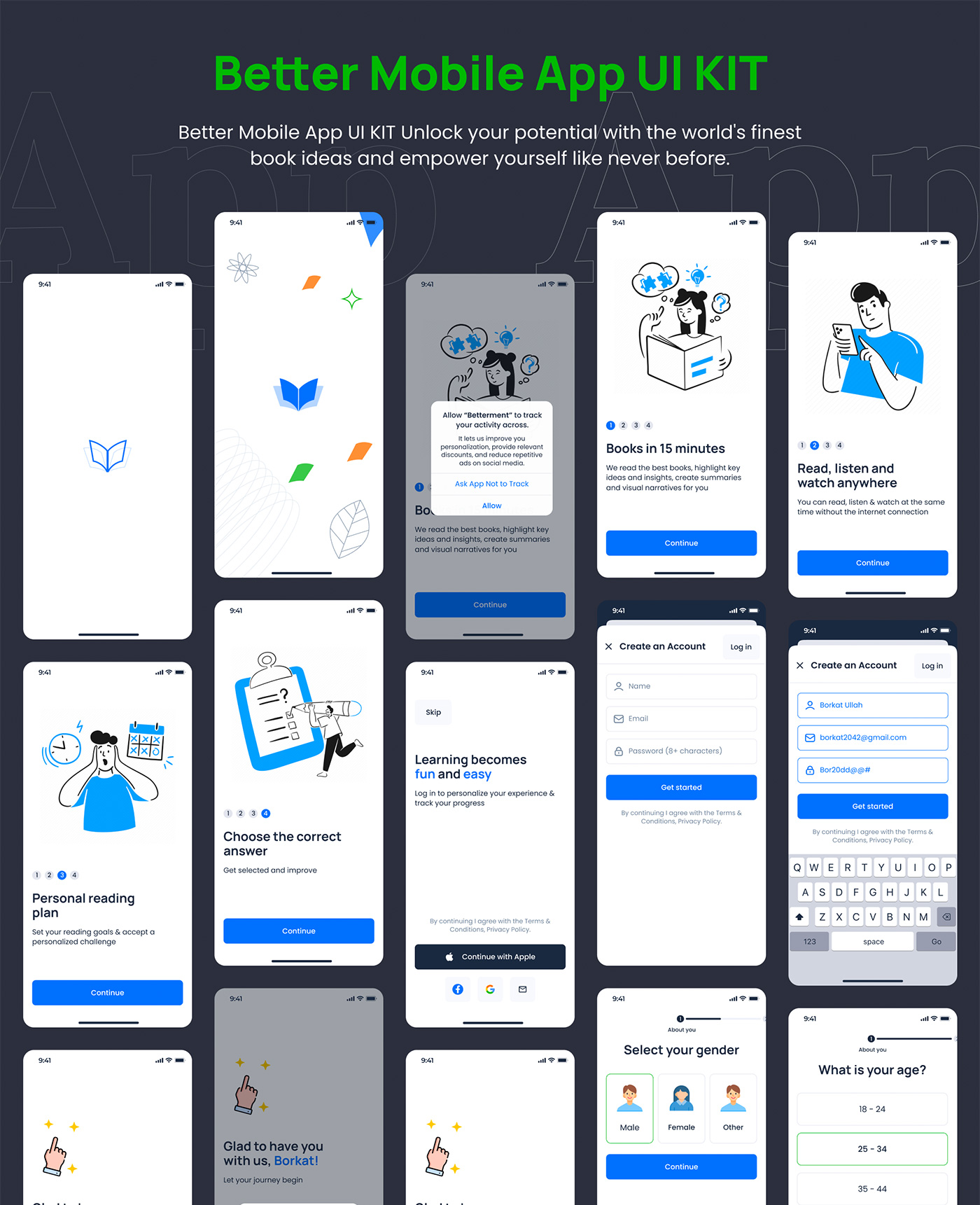Better Mobile App UI KIT 通过世界上好的书籍创意释放您的潜力,并以前所未有的方式赋予自己力量。我们提供一系列资源和工具来帮助您改善生活的各个方面,包括但不限于提高生产力、培养幸福感、实现减肥目标、管理个人财务、掌握谈判技巧、建立和培养关系、在商业上取得成功和创业精神,增强自信心等等。