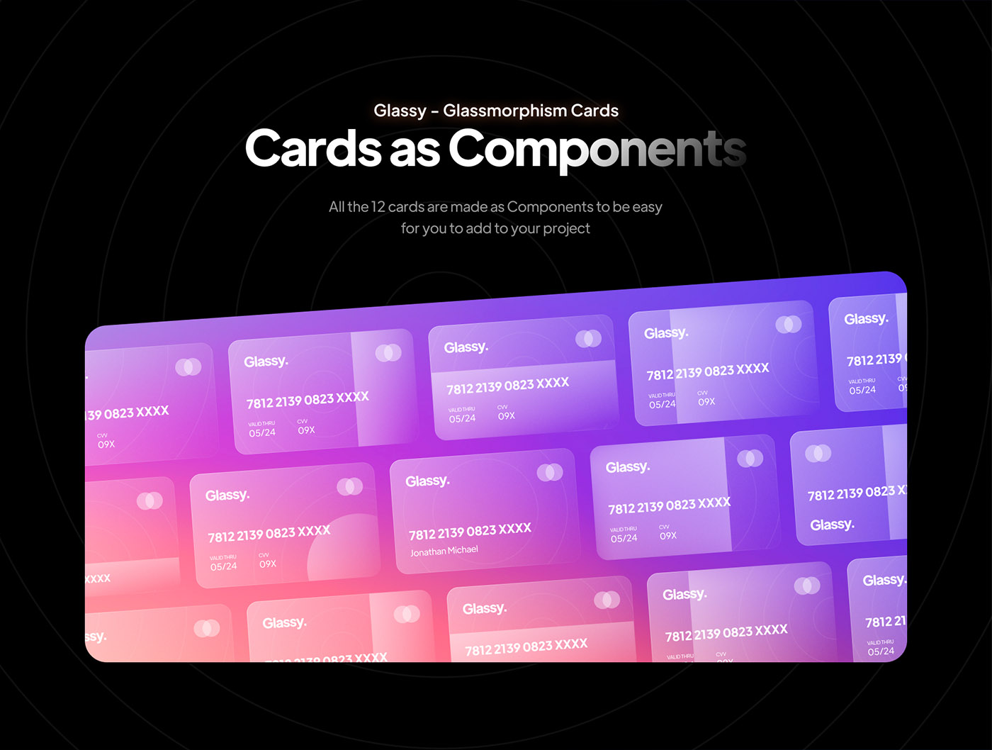 12 张时尚 Glassmorphism 透明玻璃卡片设计figma文件