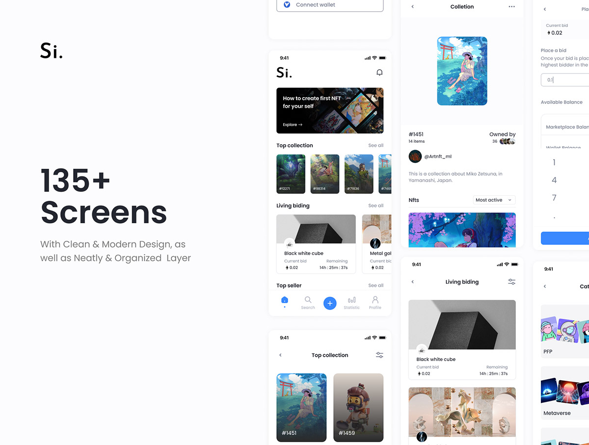 135页明暗模式干净现代的用于NFT市场的UI工具包figma源文件