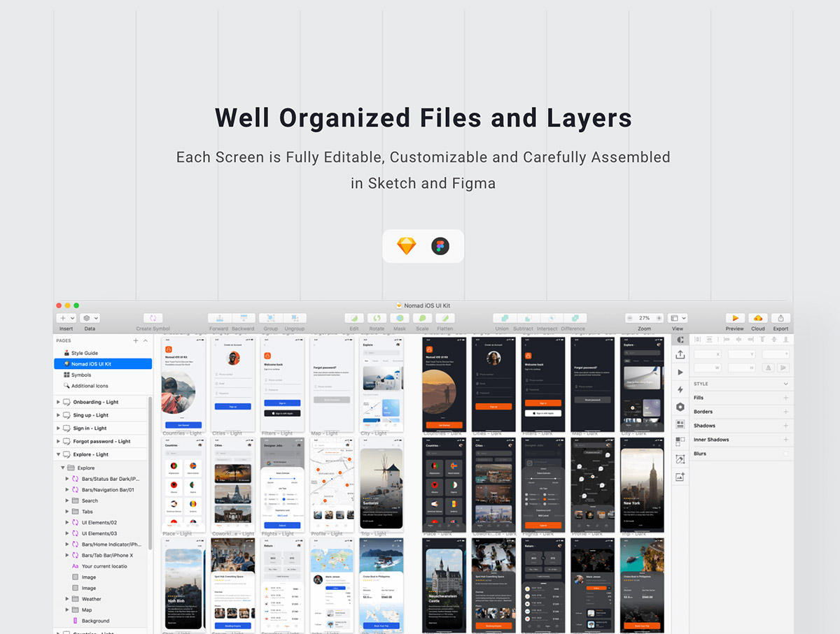 40页旅游app明暗300个UI元素,520个图标figma,sketch格式