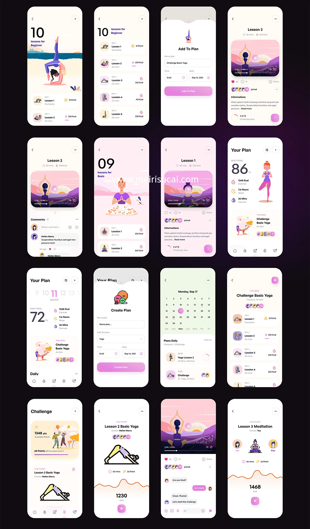 156页时尚的明暗模式瑜伽和冥想UI工具包figma源文件