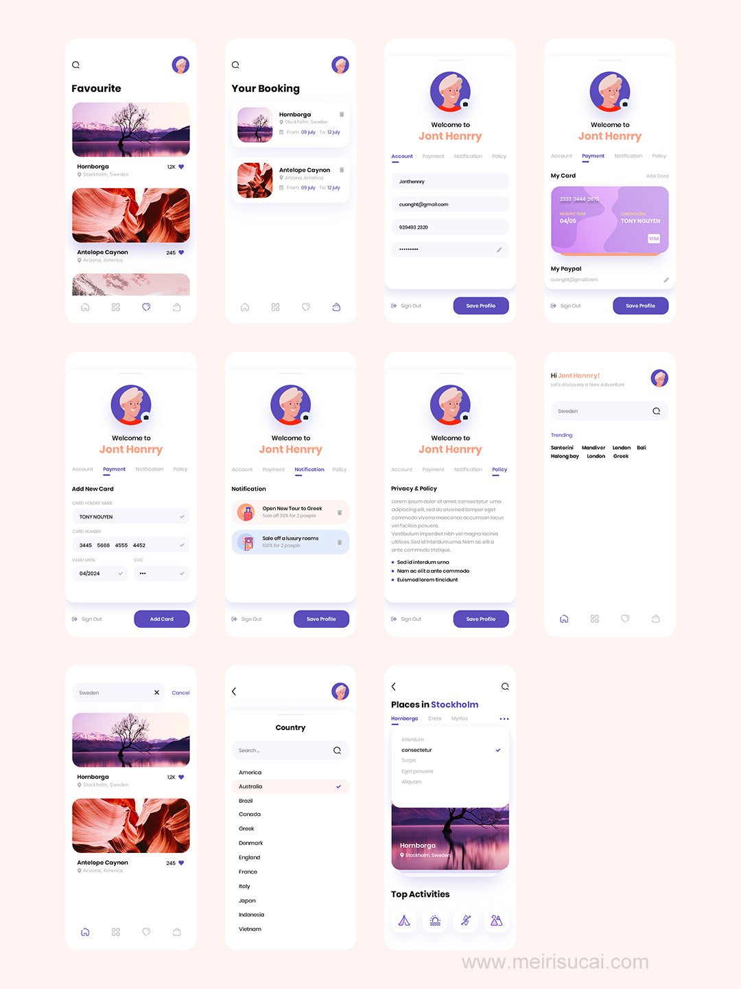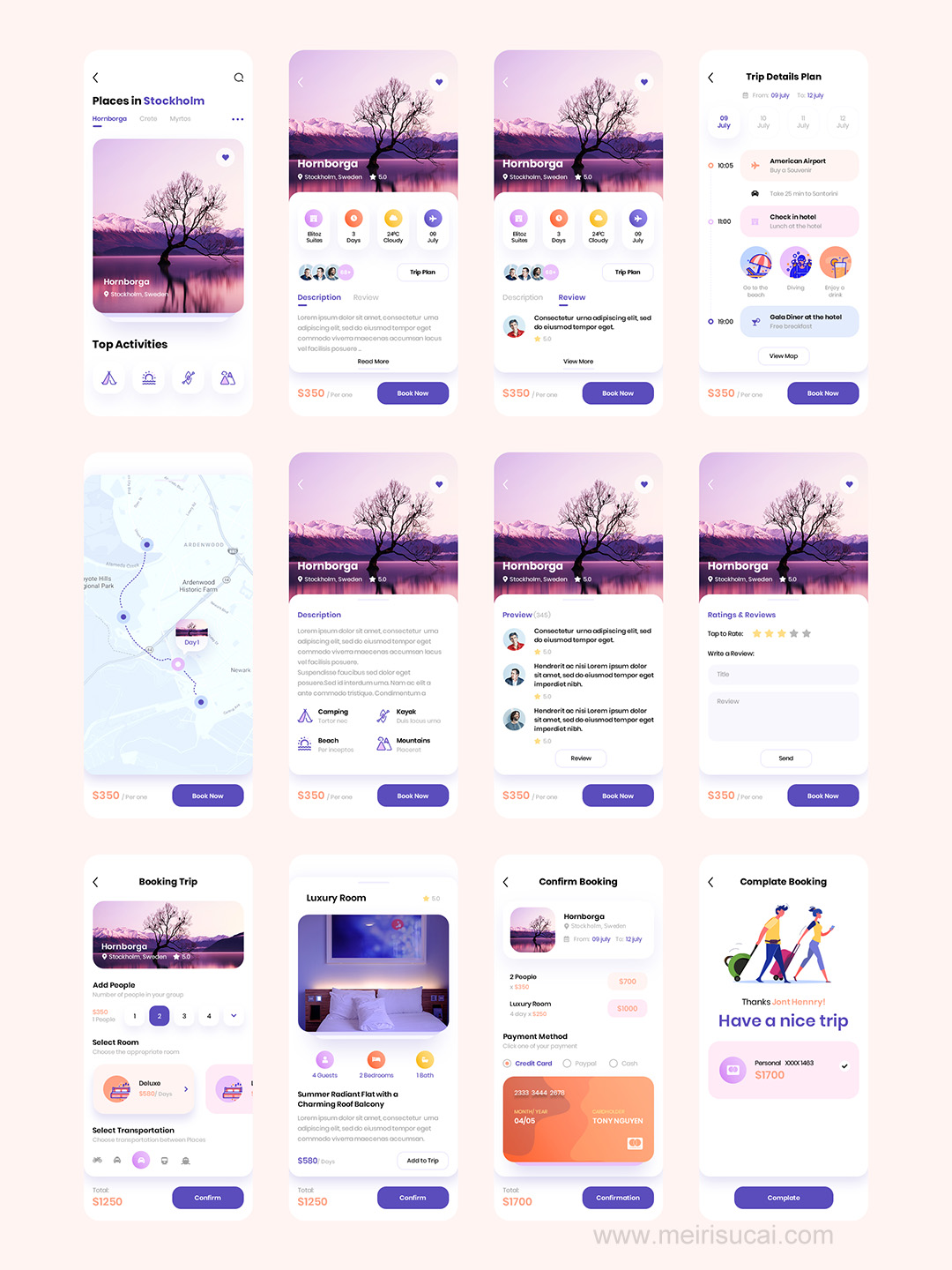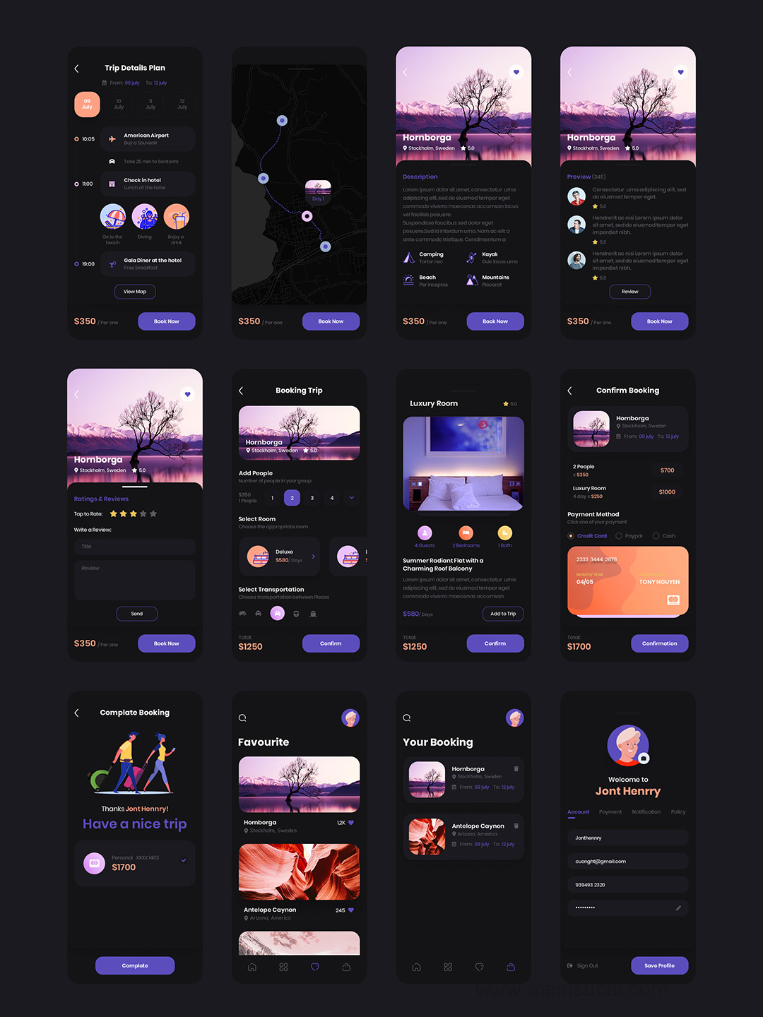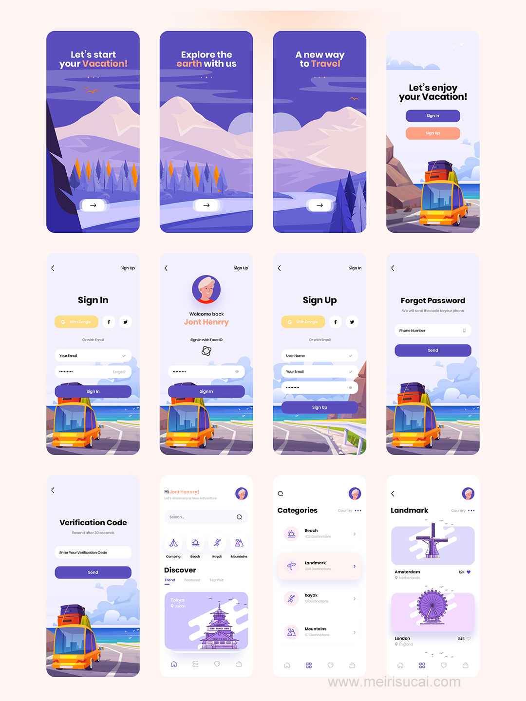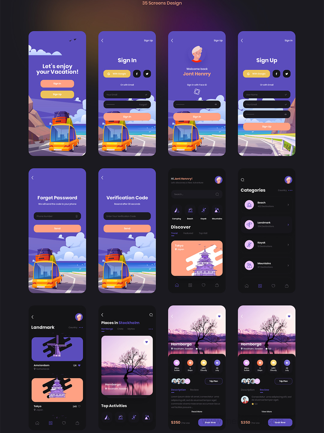 70页明暗插画风旅游app设计figma,xd,psd格式