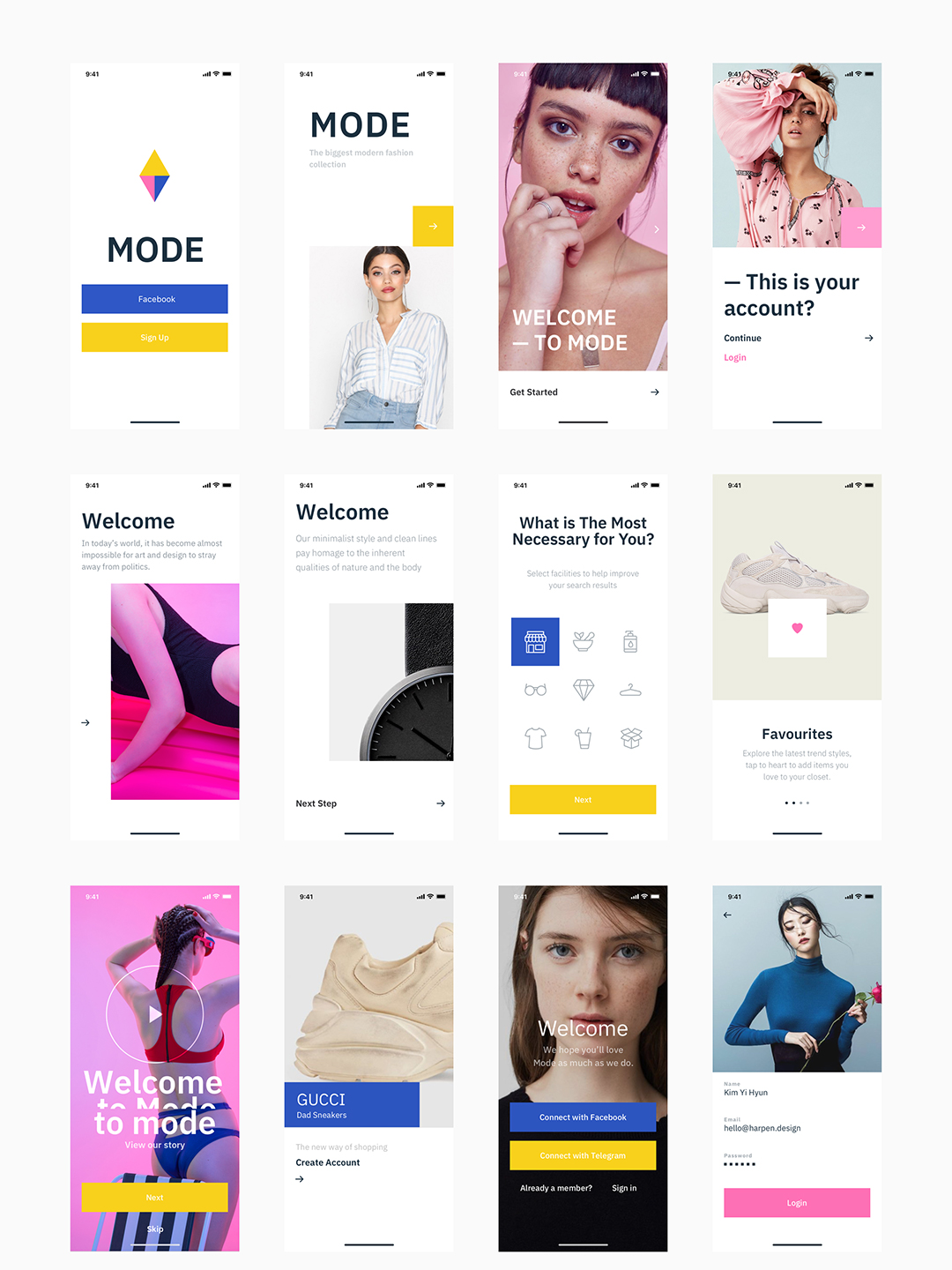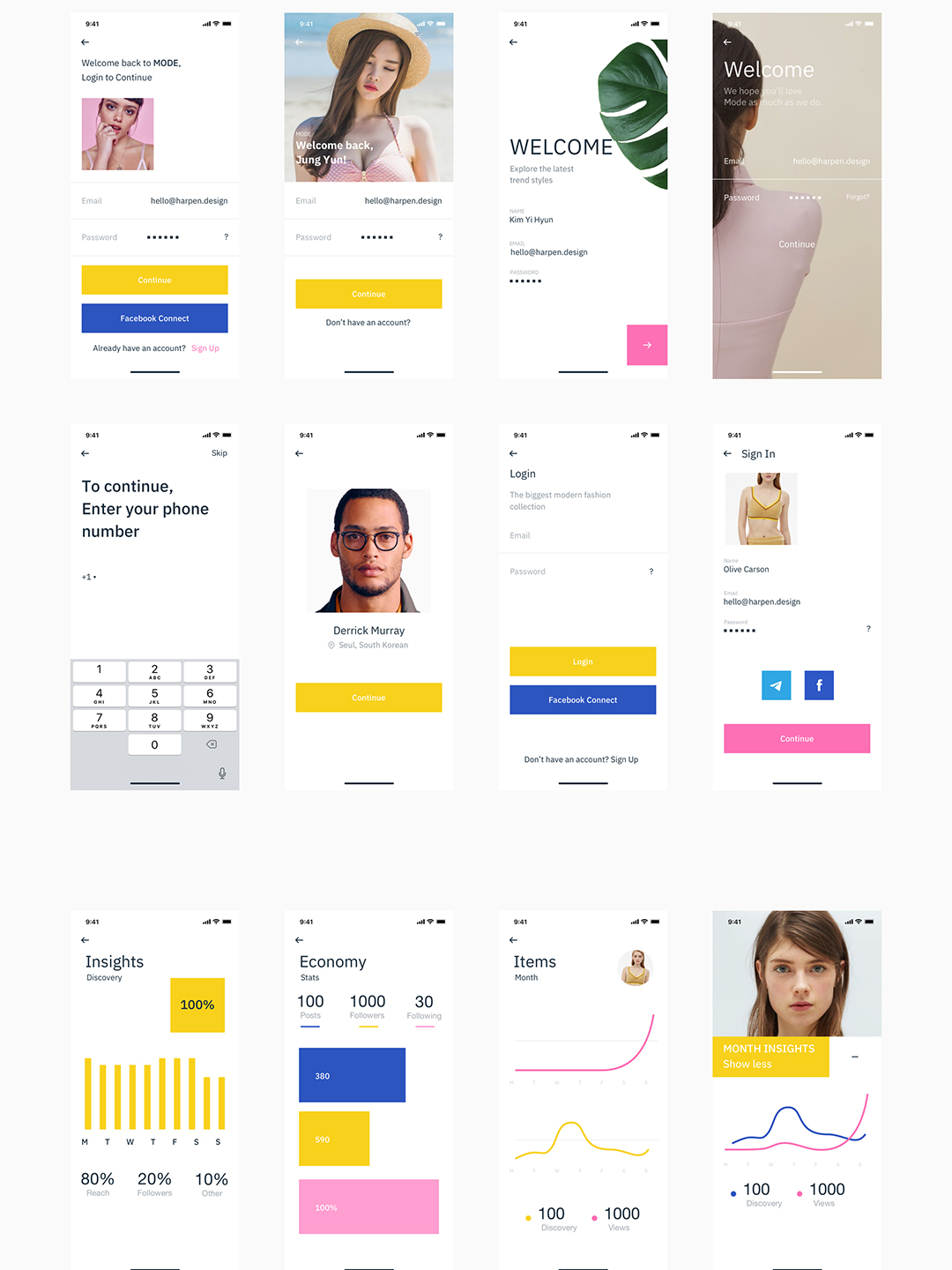 MODE UI 是一款基于简洁设计的高品质套件,适用于 iPhone X,包含 60 多个在 Sketch 中设计的 iOS 屏幕模板,涵盖 7 大热门类别(登录 / 注册、新手引导、菜单、电商、个人资料、社交、统计)
