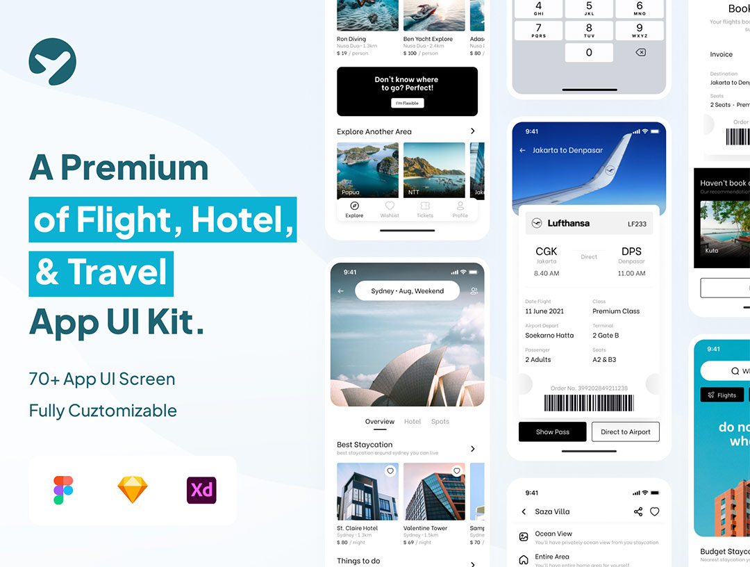 70页高级航班,酒店和旅游app设计sketch,xd,figma格式