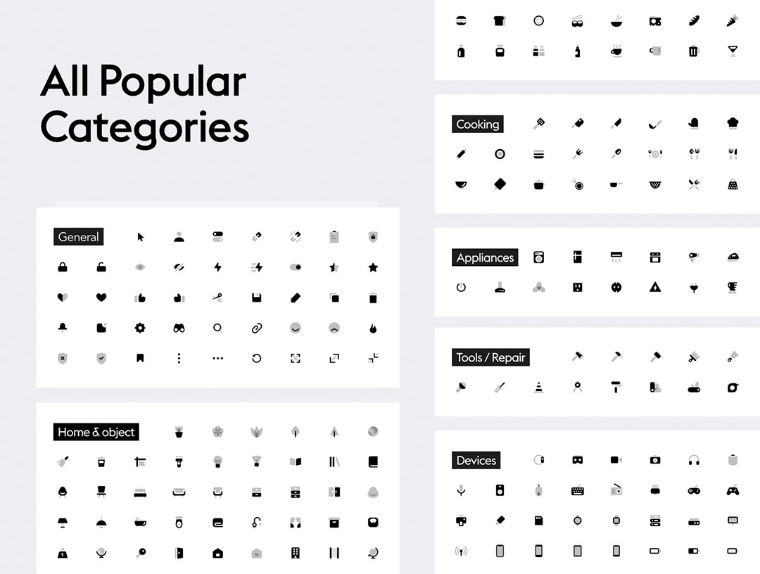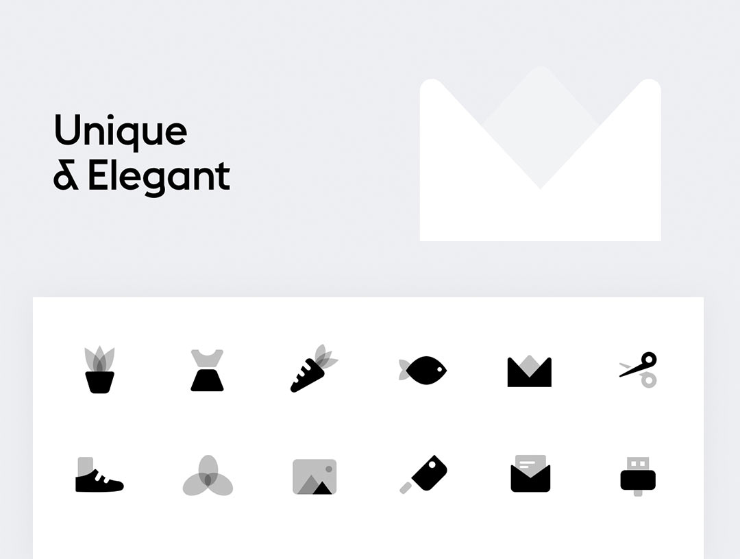 一套包含 640 个高品质双色调矢量图标的图标集,提供 4 种颜色预设(黑色、白色、蓝色、蓝红色)。它基于 24 x 24 像素网格构建,以确保在屏幕上精确的像素匹配。非常适合 iOS、Android、网站和图形设计。类别:通用、家居与物体、服装、食品、烹饪、家用电器、工具与维修、媒体、设备、天气、代码与控制、地图与旅行、通信、文本、设计、购物、金融、布局、文件与文件夹、导航
